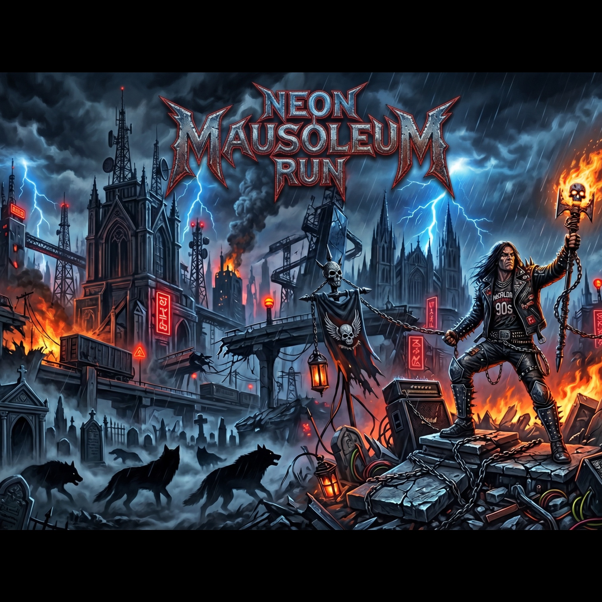European underground heavy/speed metal from the 1990s to today, inspired by obscure but vibrant continental steel without copying any single band, Title: Neon Mausoleum Run, Key: D minor, Tempo: 159 BPM, Use tight 4/4 drums, galloping rhythm guitars, twin-lead harmonies, melodic bass that stays clearly audible, and a sharp analog-grit mix, Vocals: forceful male tenor with grit, urgency, and anthemic chorus lift, Mood: urban funerary speed metal, mausoleum lights, black mirrors, chrome rain, wolves, storm highways, dead stations, ritual fire, and outlaw devotion, Arrangement: tense intro, riff-heavy verse, rising pre-chorus, explosive chorus, second verse, bridge, melodic solo, final double chorus, defiant outro, Dark, vivid, fast, heroic, underground, and faithful to European metal spirit