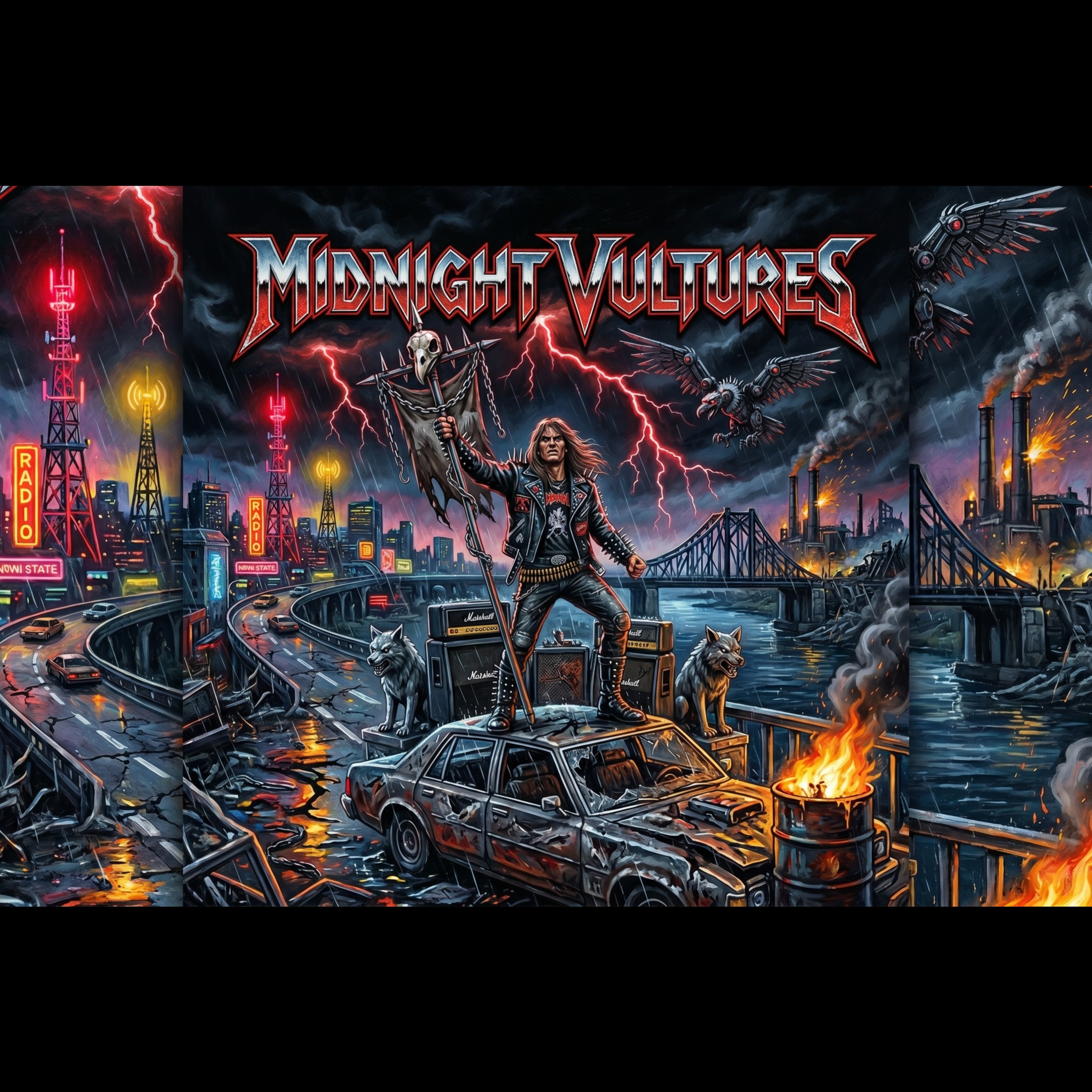 European underground traditional heavy metal, 1990s to now, inspired by obscure but vibrant steel from Sweden, Germany, Italy, Spain, and the wider continental scene without copying any single band, Title: Midnight Vultures, Key: E minor, Tempo: 164 BPM, Build the song with tight 4/4 drums, galloping rhythm guitars, screaming twin leads, melodic bass that stays audible, and a sharp, clear, analog-grit mix, Vocals: forceful male tenor with grit, urgency, and an anthemic chorus lift, Mood: neon speed metal, urban night attack, outlaw loyalty, radio towers, chrome rain, storm highways, Arrangement: cold intro, verse, rising pre-chorus, explosive chorus, second verse, bridge, solo, final double chorus, defiant outro, Dark, vivid, heroic, underground, and faithful to true European metal spirit