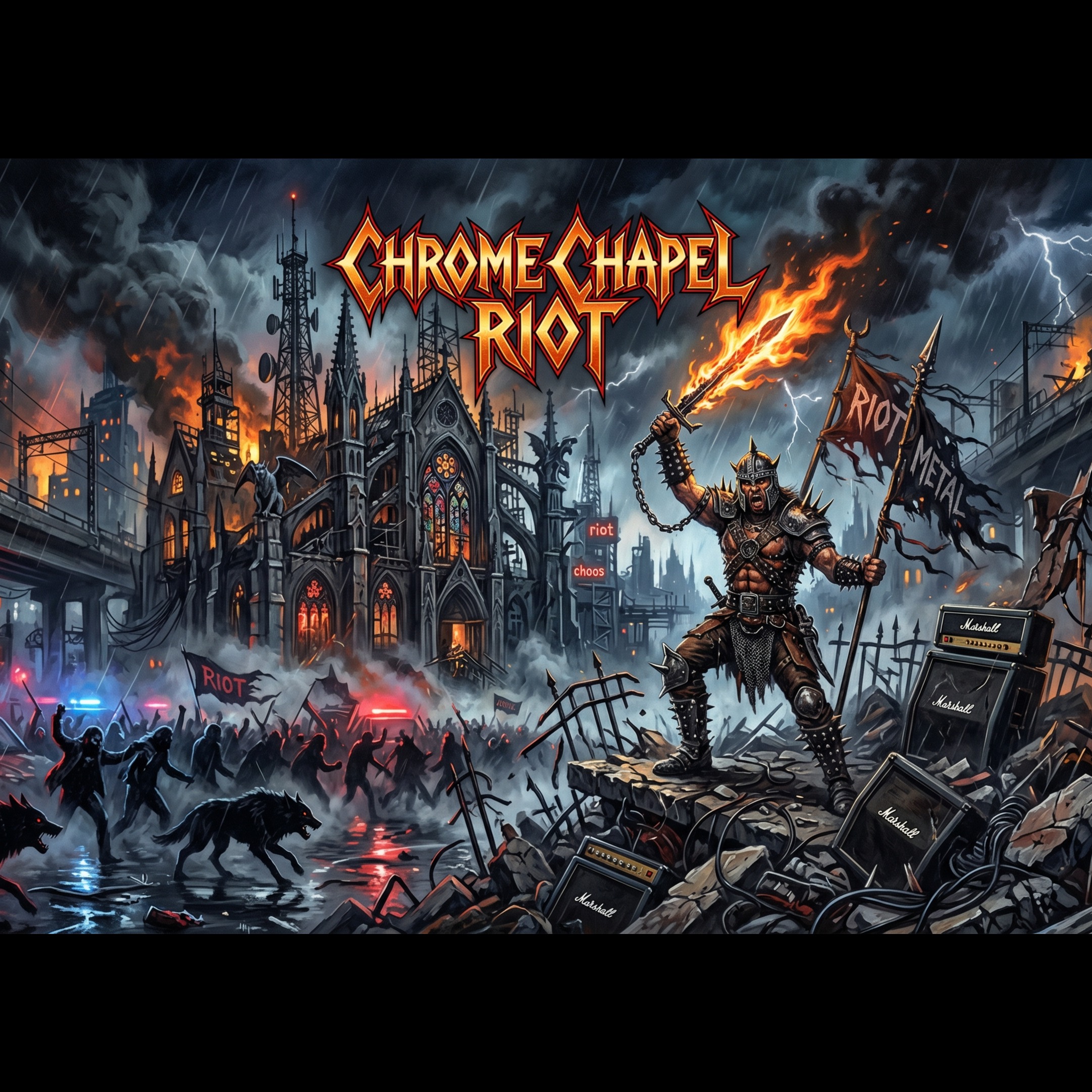 European underground heavy/speed metal from the 1990s to now, inspired by obscure but vibrant continental steel without copying any single band, Title: Chrome Chapel Riot, Key: C# minor, Tempo: 157 BPM, Use tight 4/4 drums, galloping rhythm guitars, twin-lead harmonies, melodic bass that stays clearly audible, and a sharp analog-grit mix, Vocals: forceful male tenor with grit, urgency, and anthemic chorus lift, Mood: urban ritual speed metal, black mirrors, radio towers, chrome rain, wolves, storm highways, chapel ruins, neon fire, and outlaw devotion, Arrangement: tense intro, riff-heavy verse, rising pre-chorus, explosive chorus, second verse, bridge, melodic solo, final double chorus, defiant outro, Dark, vivid, fast, heroic, underground, and faithful to true European metal spirit, raw