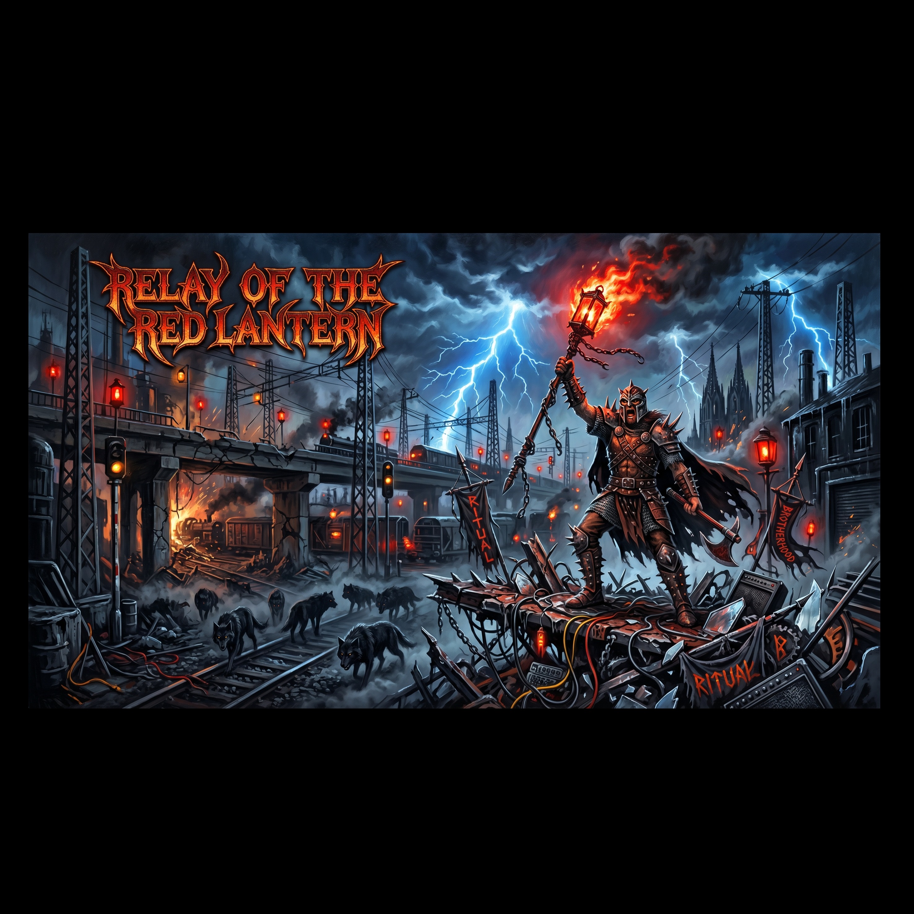European underground heavy/speed metal from the 1990s to today, inspired by obscure but vibrant continental steel without copying any single band, Title: Relay of the Red Lantern, Key: E minor, Tempo: 157 BPM, Use tight 4/4 drums, galloping rhythm guitars, twin-lead harmonies, melodic bass that stays clearly audible, and a sharp analog-grit mix, Vocals: forceful male tenor with grit, urgency, and anthemic chorus lift, Mood: relay-tower midnight metal, red lanterns, freight rails, chrome rain, wolves, storm highways, border lights, ritual fire, and outlaw devotion, Arrangement: tense intro, riff-heavy verse, rising pre-chorus, explosive chorus, second verse, bridge, melodic solo, final double chorus, defiant outro, Dark, vivid fast, heroic, underground and faithful to European metal spirit