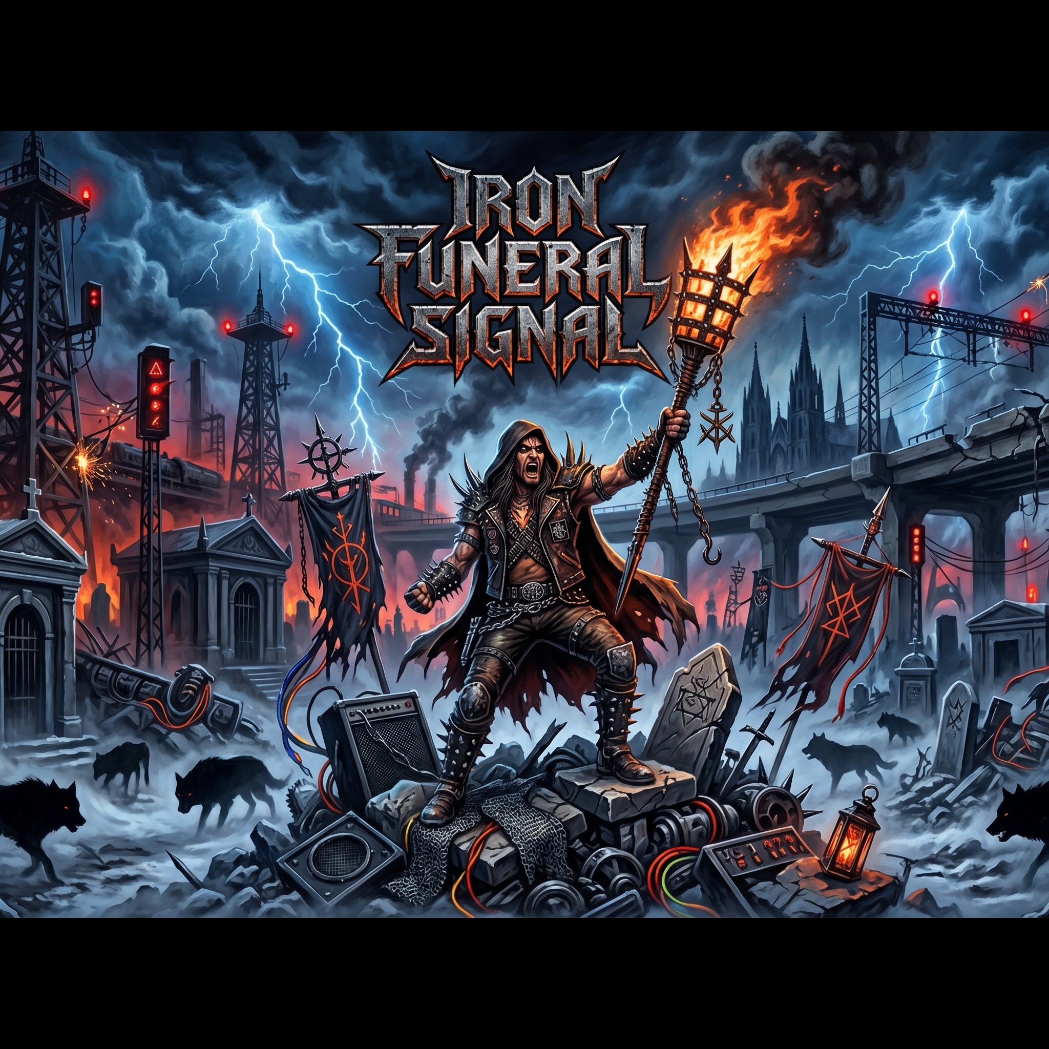 European underground heavy/speed metal from the 1990s to today, inspired by obscure but vibrant continental steel without copying any single band, Title: Iron Funeral Signal, Key: G minor, Tempo: 158 BPM, Use tight 4/4 drums, galloping rhythm guitars, twin-lead harmonies, melodic bass that stays clearly audible, and a sharp analog-grit mix, Vocals: forceful male tenor with grit, urgency, and anthemic chorus lift, Mood: funerary signal heavy metal, graveyard rail lines, black mirrors, chrome rain, wolves, storm highways, dead stations, ritual fire, and outlaw devotion, Arrangement: tense intro, riff-heavy verse, rising pre-chorus, explosive chorus, second verse, bridge, melodic solo, final double chorus, defiant outro, Dark, vivid, fast, heroic, underground, and faithful to true European metal spirit