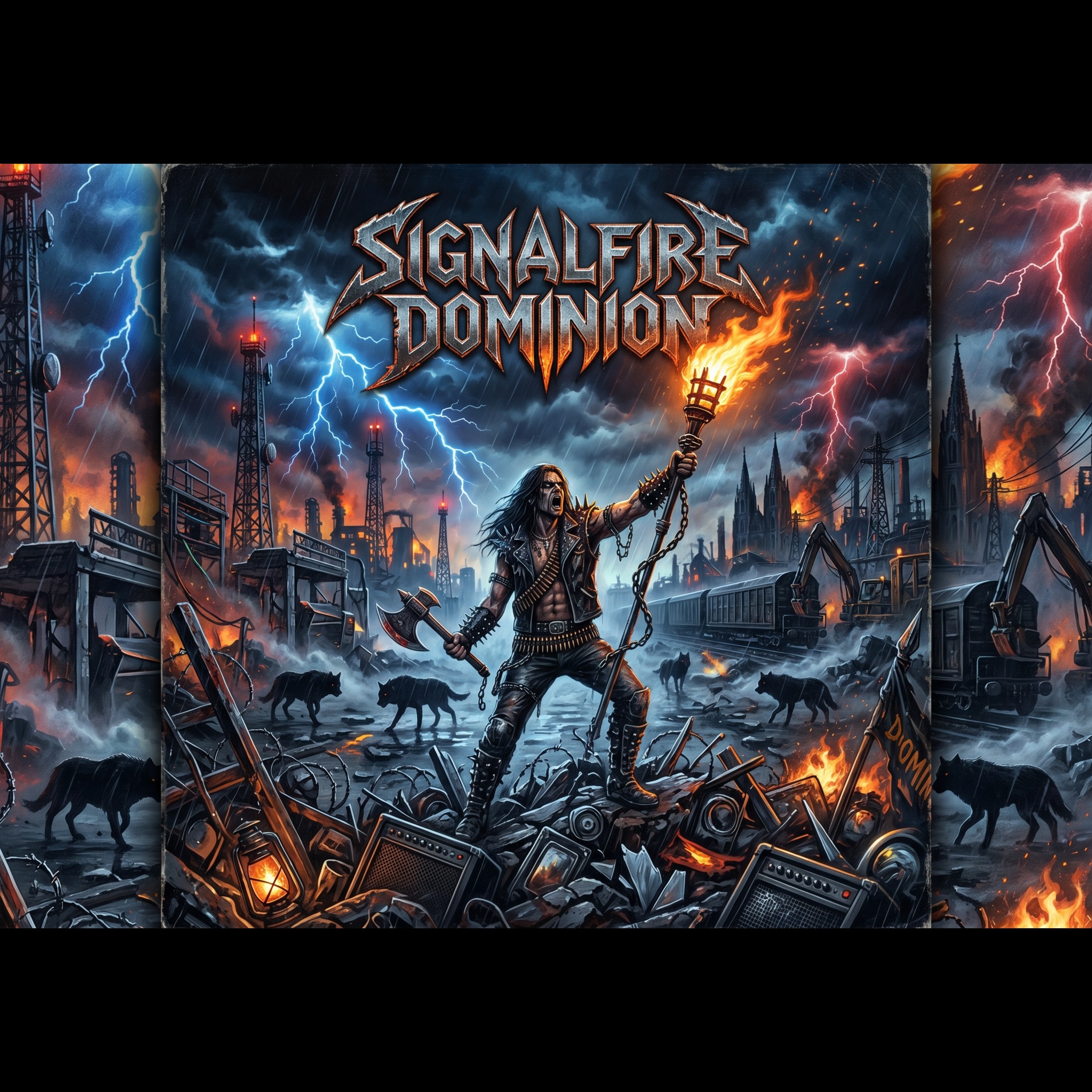European underground heavy/speed metal from the 1990s to today, inspired by obscure but vibrant continental steel without copying any single band, Title: Signalfire Dominion, Key: F minor, Tempo: 161 BPM, Use tight 4/4 drums, galloping rhythm guitars, twin-lead harmonies, melodic bass that stays clearly audible, and a sharp analog-grit mix, Vocals: forceful male tenor with grit, urgency, and anthemic chorus lift, Mood: border-road heavy metal, radio towers, chrome rain, black mirrors, wolves, storm highways, checkpoint ruins, ritual fire, and outlaw devotion, Arrangement: tense intro, riff-heavy verse, rising pre-chorus, explosive chorus, second verse, bridge, melodic solo, final double chorus, defiant outro, Dark, vivid, fast, heroic, underground, and faithful to true European metal spirit, Steel rides!