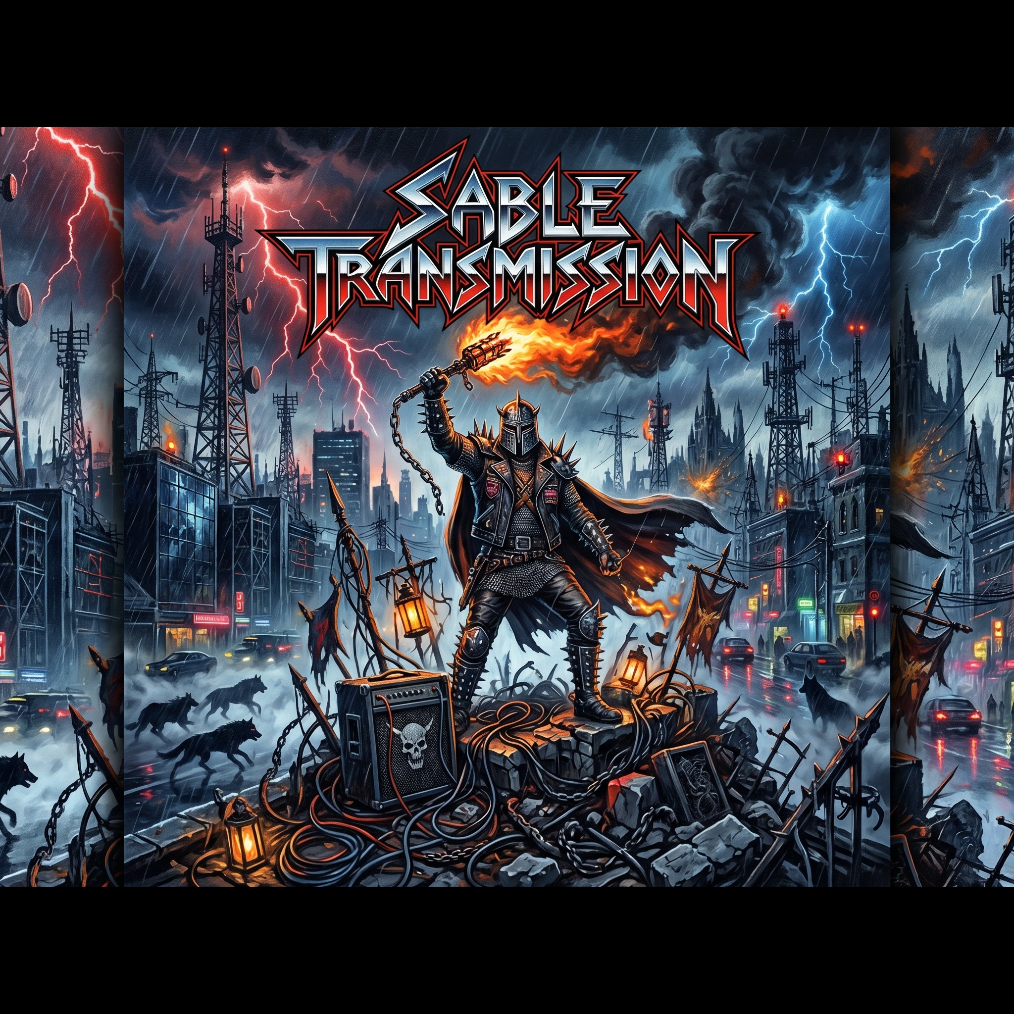 European underground heavy/speed metal from the 1990s to today, inspired by obscure but vibrant continental steel without copying any single band, Title: Sable Transmission, Key: B minor, Tempo: 153 BPM, Use tight 4/4 drums, galloping rhythm guitars, twin-lead harmonies, melodic bass that stays clearly audible, and a sharp analog-grit mix, Vocals: forceful male tenor with grit, urgency, and anthemic chorus lift, Mood: occult broadcast heavy metal, radio towers, black mirrors, chrome rain, wolves, storm highways, neon sirens, ritual fire, and outlaw devotion, Arrangement: tense intro, riff-heavy verse, rising pre-chorus, explosive chorus, second verse, bridge, melodic solo, final double chorus, defiant outro, Dark, vivid, fast, heroic, underground, and faithful to true European metal spirit