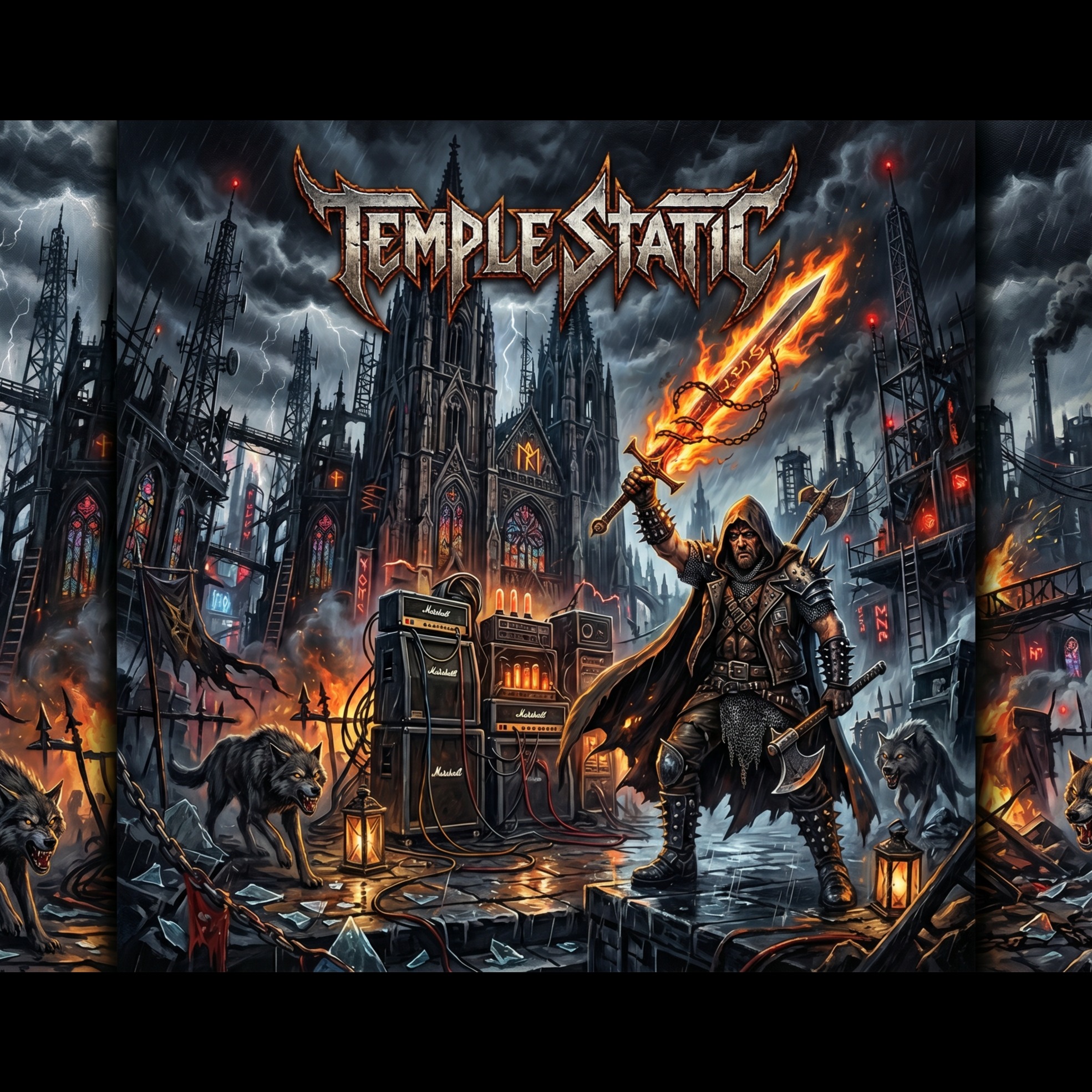 European underground heavy/speed metal from the 1990s to today, inspired by obscure but vibrant continental steel without copying any single band, Title: Temple Static, Key: D minor, Tempo: 156 BPM, Use tight 4/4 drums, galloping rhythm guitars, twin-lead harmonies, melodic bass that stays clearly audible, and a sharp, cold, analog-grit mix, Vocals: forceful male tenor with grit, urgency, and an anthemic chorus lift, Mood: occult urban heavy metal, storm-lit cathedrals, radio towers, wolves, chrome rain, black mirrors, ritual fire, midnight rebellion, Arrangement: eerie intro, riff-heavy verse, rising pre-chorus, explosive chorus, second verse, bridge, melodic solo, final double chorus, defiant outro, Dark, vivid, heroic, fast, underground, and faithful to true European metal spirit, Steel