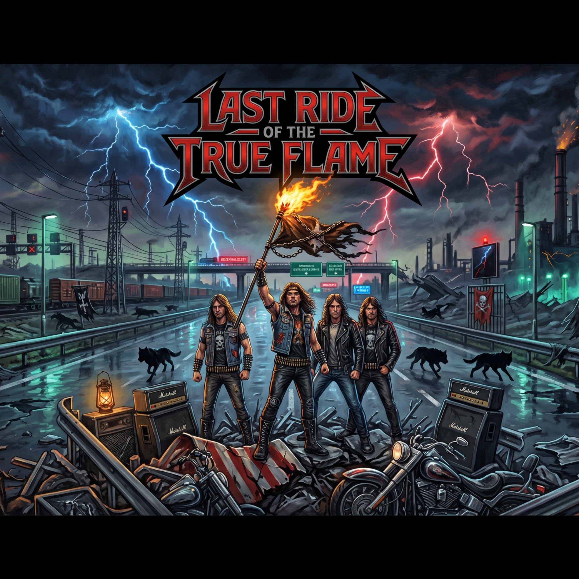 European underground heavy/speed metal inspired by obscure but vibrant continental steel with no direct imitation, Title: Last Ride of the True Flame, Key: D minor, Tempo: 148 BPM, Use tight 4/4 drums, galloping rhythm guitars, twin-lead harmonies, melodic bass that stays audible, and an analog-grit mix with a strong chorus lift, Vocals: forceful male tenor with grit, urgency, conviction, and a triumphant melodic edge, Mood: final highway metal, neon rain, chrome reflections, border lights, leather brotherhood, wolves, storm roads, ritual fire, and outlaw devotion, Arrangement: tense intro, riff-heavy verse, rising pre-chorus, explosive chorus, second verse, bridge, melodic solo, final double chorus, defiant outro, Dark, vivid, heroic, underground, faithful to true European metal spirit, !!