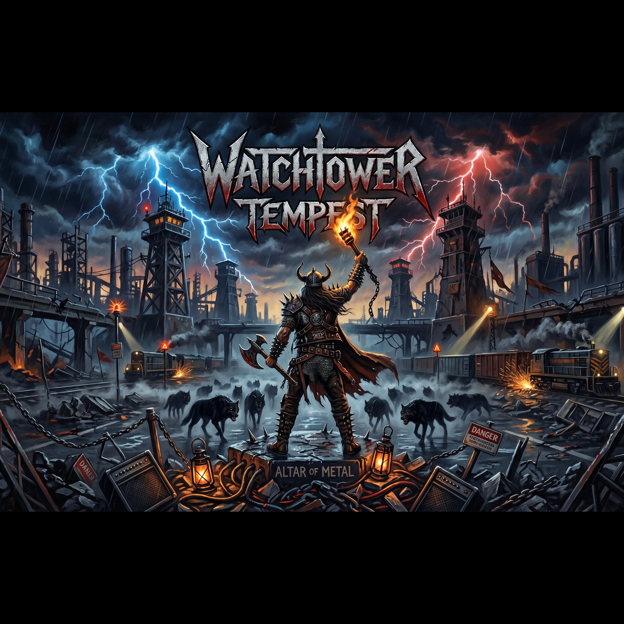 European underground heavy/speed metal from the 1990s to today, inspired by obscure but vibrant continental steel without copying any single band, Title: Watchtower Tempest, Key: F minor, Tempo: 157 BPM, Use tight 4/4 drums, galloping rhythm guitars, twin-lead harmonies, melodic bass that stays clearly audible, and a sharp analog-grit mix, Vocals: forceful male tenor with grit, urgency, and anthemic chorus lift, Mood: watchtower storm metal, freightyard graves, chrome rain, black mirrors, wolves, warning beacons, border roads, ritual fire, outlaw devotion, Arrangement: tense intro, riff-heavy verse, rising pre-chorus, explosive chorus, second verse, bridge, melodic solo, final double chorus, defiant outro, Dark, vivid, fast, heroic, underground, faithful to true European metal spirit, raw!
