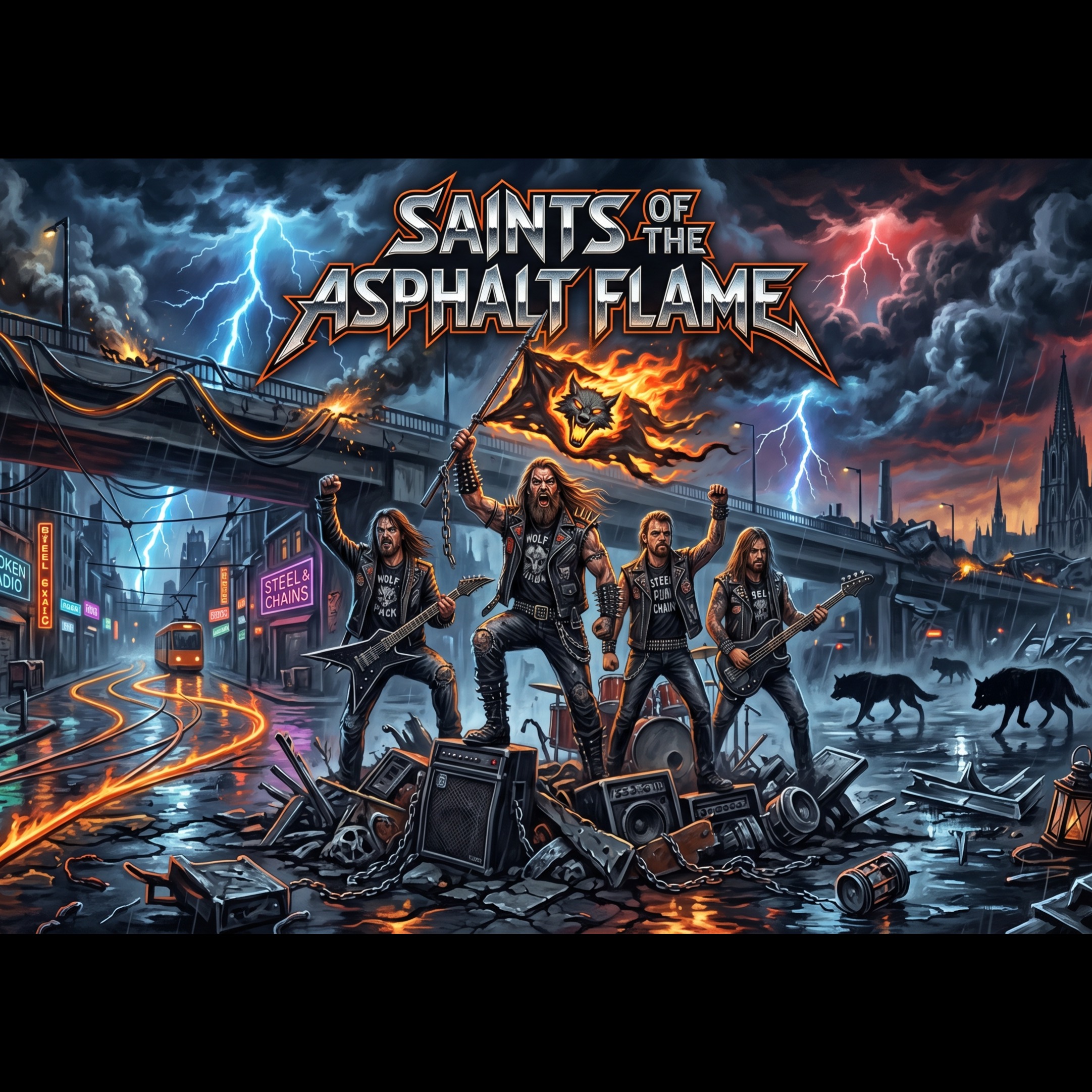 European underground heavy/speed metal from the 1990s to today, inspired by obscure but vibrant continental steel without copying any single band, Title: Saints of the Asphalt Flame, Key: A major, Tempo: 150 BPM, Use tight 4/4 drums, galloping rhythm guitars, twin-lead harmonies, melodic bass that stays clearly audible, and an analog-grit mix with a clear, powerful chorus lift, Vocals: forceful male tenor with grit, urgency, conviction, and a triumphant melodic edge, Mood: street brotherhood heavy metal, neon rain, chrome reflections, radio towers, tramlines, leather loyalty, wolves, ritual fire, and outlaw devotion, Arrangement: tense intro, riff-heavy verse, rising pre-chorus, explosive anthem chorus, second verse, bridge, melodic solo, final double chorus, defiant outro, Dark, vivid, heroic, underground, faithful to true European metal spirit