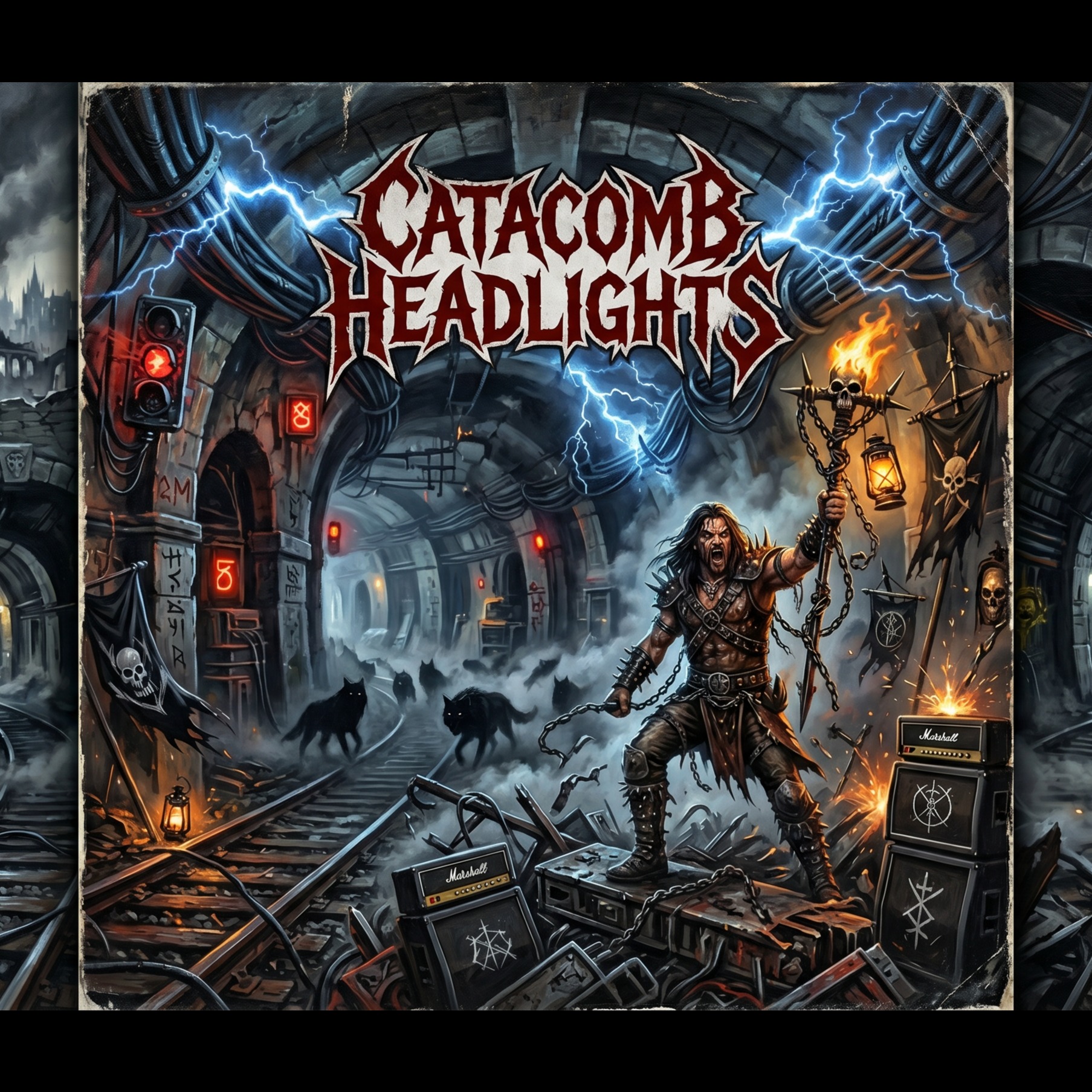 European underground heavy/speed metal from the 1990s to today, inspired by obscure but vibrant continental steel without copying any single band, Title: Catacomb Headlights, Key: A# minor, Tempo: 156 BPM, Use tight 4/4 drums, galloping rhythm guitars, twin-lead harmonies, melodic bass that stays audible, and a sharp analog-grit mix, Vocals: forceful male tenor with grit urgency, and anthemic chorus lift, Mood: subterranean ritual speed metal, tunnel rain, rail ghosts, black mirrors, chrome smoke, wolves, hidden signals, urban catacombs, and outlaw devotion, Arrangement: tense intro, riff-heavy verse, rising pre-chorus, explosive chorus, second verse, bridge, melodic solo, final double chorus, defiant outro, Dark, vivid, fast, heroic underground, and faithful to true European metal spirit