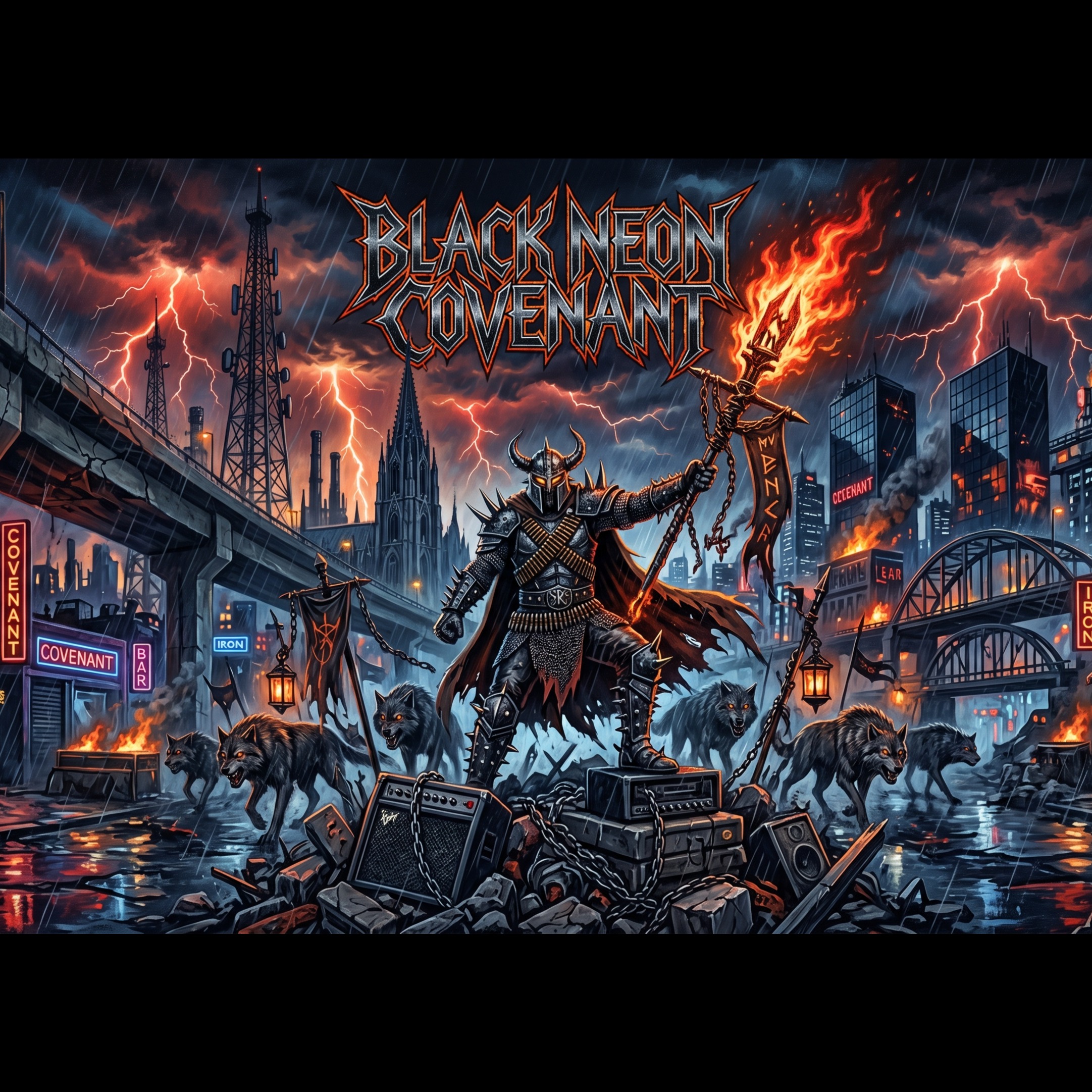 European underground heavy/speed metal from the 1990s to today, inspired by obscure but vibrant continental steel without copying any single band, Title: Black Neon Covenant, Key: B minor, Tempo: 160 BPM, Use tight 4/4 drums, galloping rhythm guitars, twin-lead harmonies, melodic bass that stays clearly audible, and a sharp analog-grit mix, Vocals: forceful male tenor with grit, urgency, and an anthemic chorus lift, Mood: ritual urban heavy metal, black mirrors, radio towers, chrome rain, outlaw nights, storm highways, neon fire, wolves, and steel devotion, Arrangement: tense intro, riff-heavy verse, rising pre-chorus, explosive chorus, second verse, bridge, melodic solo, final double chorus, defiant outro, Dark, vivid, fast, heroic, underground, and faithful to true European metal spirit