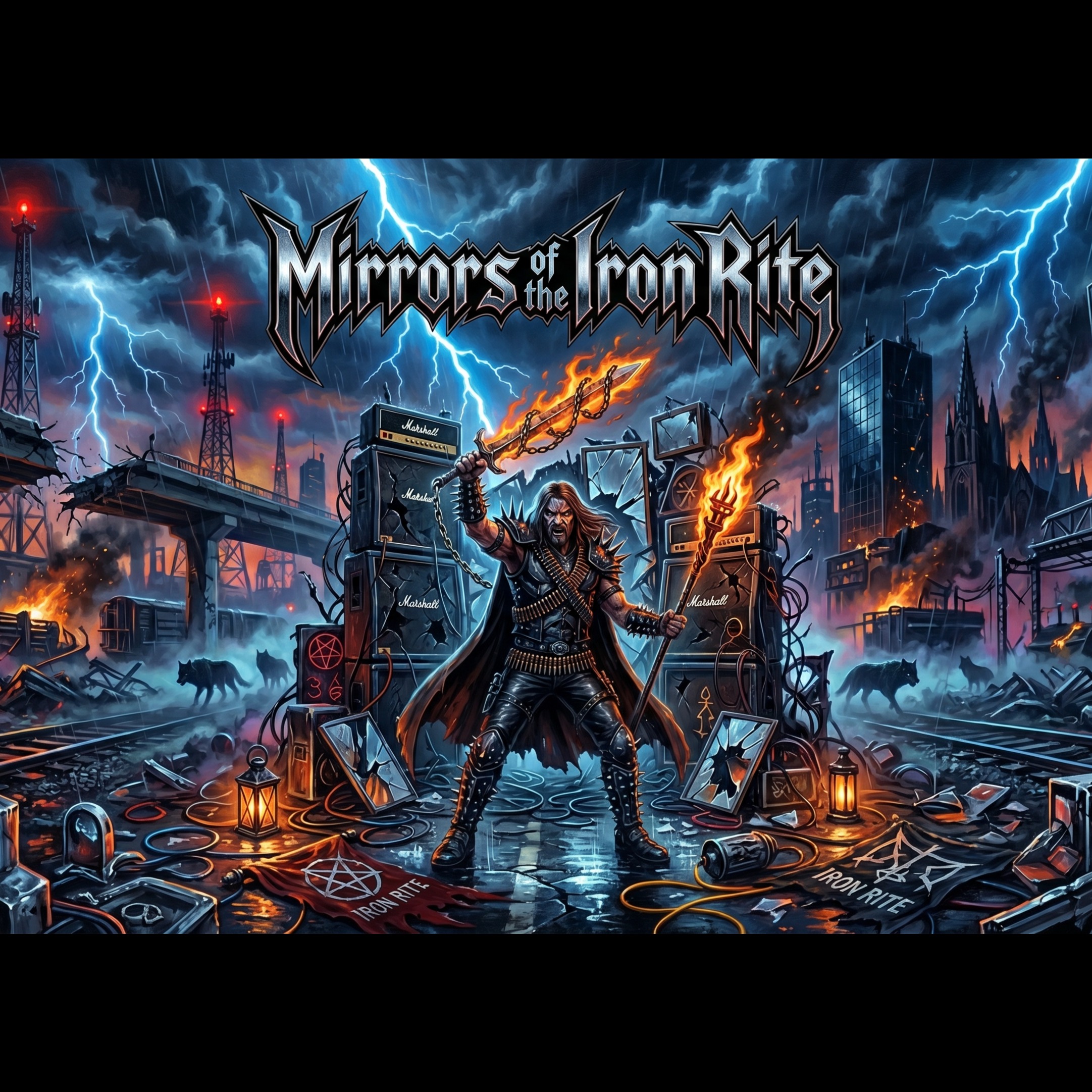 European underground heavy/speed metal from the 1990s to today, inspired by obscure but vibrant continental steel without copying any single band, Title: Mirrors of the Iron Rite, Key: G minor, Tempo: 154 BPM, Use tight 4/4 drums, galloping rhythm guitars, twin-lead harmonies, melodic bass that stays clearly audible, and a sharp analog-grit mix, Vocals: forceful male tenor with grit, urgency, and anthemic chorus lift, Mood: occult night-drive heavy metal, black mirrors, radio towers, chrome rain, wolves, ritual fire, storm highways, and midnight devotion, Arrangement: tense intro, riff-heavy verse, rising pre-chorus, explosive chorus, second verse, bridge, melodic solo, final double chorus, defiant outro, Dark, vivid, fast, heroic, underground, faithful to true European metal spirit, Steel