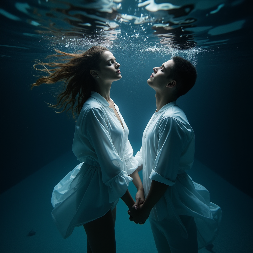 Deep melodic house with aquatic soundscapes and introspective journey, swimming through emotion anthem, Female vocalist ethereal yet powerful delivery, underwater processing effects on verses clearing in chorus, Intro features actual underwater recordings, bubbles, whale song processed as bass, building with liquid synths, Verses use deep house groove, sub-bass rolling like waves, filtered percussion creating submerged feeling, Lyrics use drowning-floating metaphor for relationship, Pre-chorus surfaces with breathy vocals and rising frequency sweep, Chorus breaks surface - clear vocals, driving beat, euphoric synth chords, representing breathing again but wanting to go back under, Post-chorus features liquid arpeggios and diving sensation, Bridge shows acceptance of depth, Final drop adds orchestral elements, Outro genius - sound submerges again slowly, heartbeat synced with kick drum slowing, final breath held then released underwater creating bubbles, long fade with just deep sub-bas