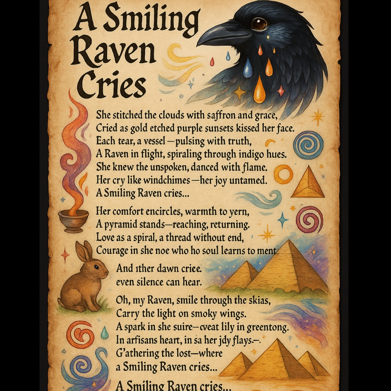 Surf rock + healing resonance, Male lead (The Lover) with airy female echoes, Style inspired by “Holding Out for a Hero” (Bonnie Tyler) + carefree vibe of “Mellow Yellow” (Donovan), Uplifting, poetic, symbolic, Include subtle 528 Hz harmonic pad (no distortion), shimmering guitars with reverb, heartbeat-like drums, wind-textured atmosphere, and echoing vocals (call/response like Raven & Teardrops), Theme: “A Smiling Raven Cries” – a pas de deux of joy and sorrow, Verses should lift like flight, choruses ground like morning dew, Use sacred tones, emotional arc of light through pain, Narrative: A poetic soul addresses the Raven—honoring her tears, strength, and spirit as sacred, End in ascension—hopeful and timeless, Render full song from provided lyrics, ‑Heavy Rock, ‑Metal, ‑Trap, ‑Hip-Hop, ‑EDM, ‑Synthwave, ‑Lo-fi, ‑Piano Ballad, ‑Folk-Twang Country, ‑Electro-Pop