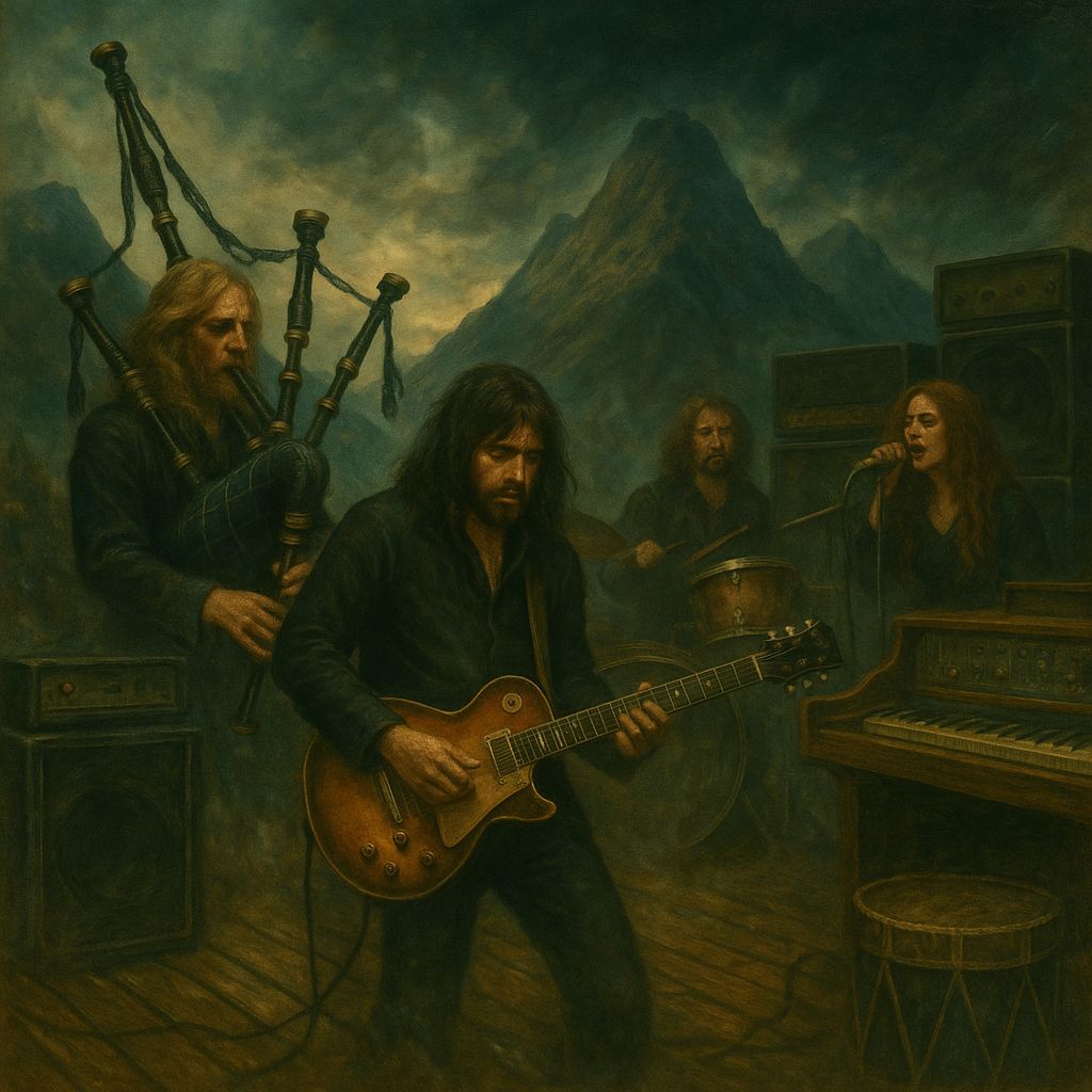 Live 1967 Monterey Pop Festival heavy rock performance with dark dropped-tuned guitars, a thick tube-amp tone, and heavy bass hitting hard, Scottish bagpipes leading with loud, haunting minor-key melodies, Strong festival drums with Highland drum, dragon drum, and bodhrán pounding a deep steady rhythm, Hammond organ growling under the mix with Mellotron swirling softly in the background, Male rock vocal only — gritty, powerful, and emotional, Big jam section with loud bagpipes, heavy drums, and dark psychedelic guitar riffs