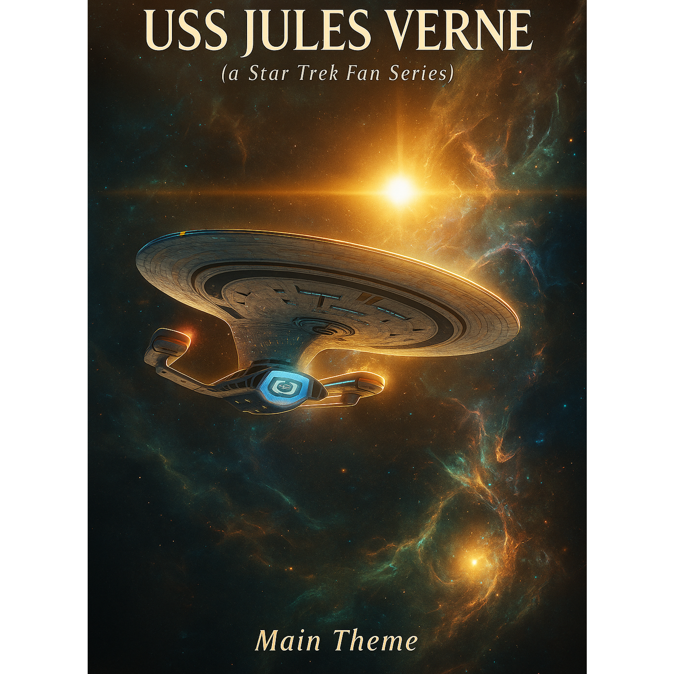 Use a focused cinematic 1990s Star Trek TNG Era orchestral sci-fi sound with a clear structure designed for a maximum length of 2 minutes, Start with a short dramatic orchestral swell, then move immediately into the main theme, The music should build quickly and resolve without long extensions, Emphasize concise development, noble harmonies, and minimal female choir pads, Avoid prolonged ambient sections, Keep the tempo steady and purposeful, with clear melodic lines and strong forward motion, The piece must finish cleanly before the 2-minute mark