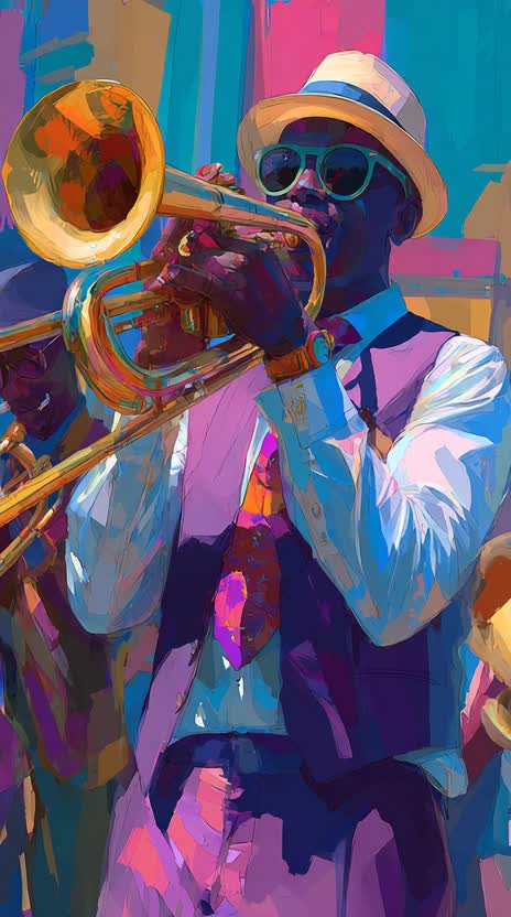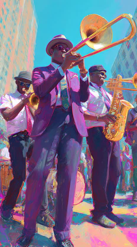 bombastic funk, low male voice, falsetto choir, brass section, bass