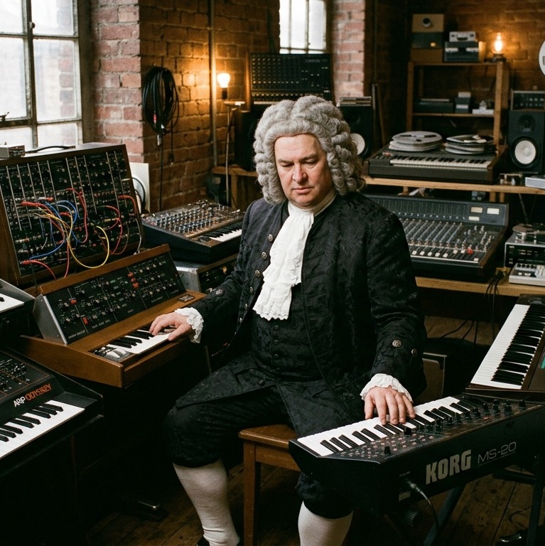 Funk, big band jazz, fusion, jazztronica, synth, layered synth harmonies, dance music, funky bass, funky rythm guitar, emphatic brass jabs, funky hammond organ, funky rhodes piano, long melody line, flowing melody, groovy, bouncy, hard driving beat, medium tempo, 10 min music, long hammond organ solo, long rhodes piano, long guitar solo, long drum sllo, long bass solo, long trumpet solo, long sax soll, long trombone solo, conga drums