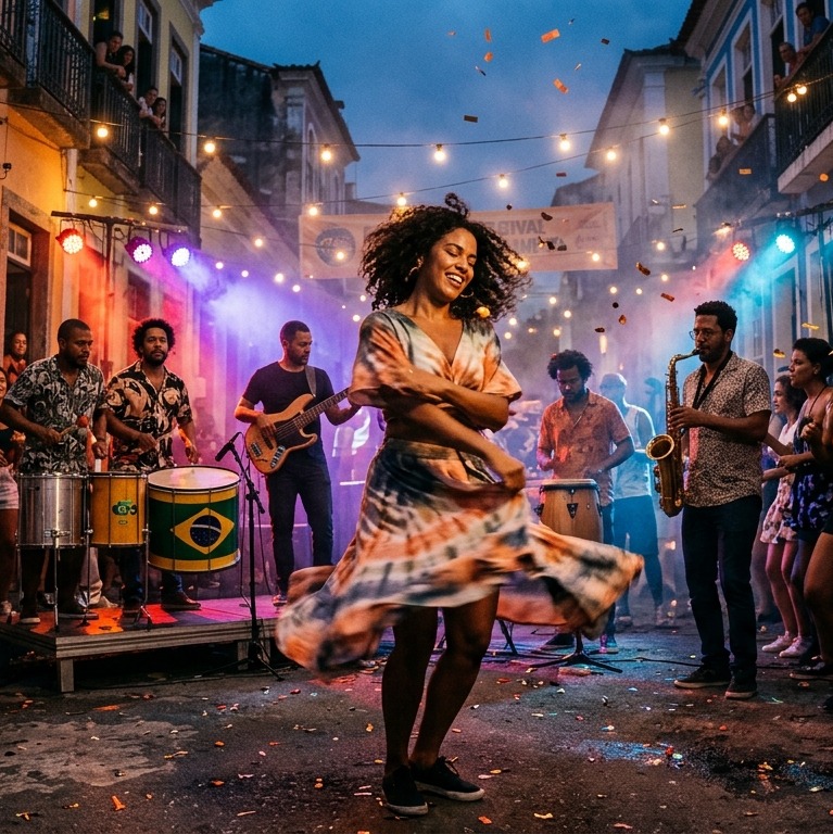 [Instrumentation: Dominant electric lead guitar, heavy slap bass, syncopated Brazilian percussion with hand drums and cymbals, Brass section providing a powerful harmonic foundation with punchy jazz stabs, B3 organ and piano providing complex jazz chords, Multiple layers of shimmering 80s synth-pop pads and lead textures, ]