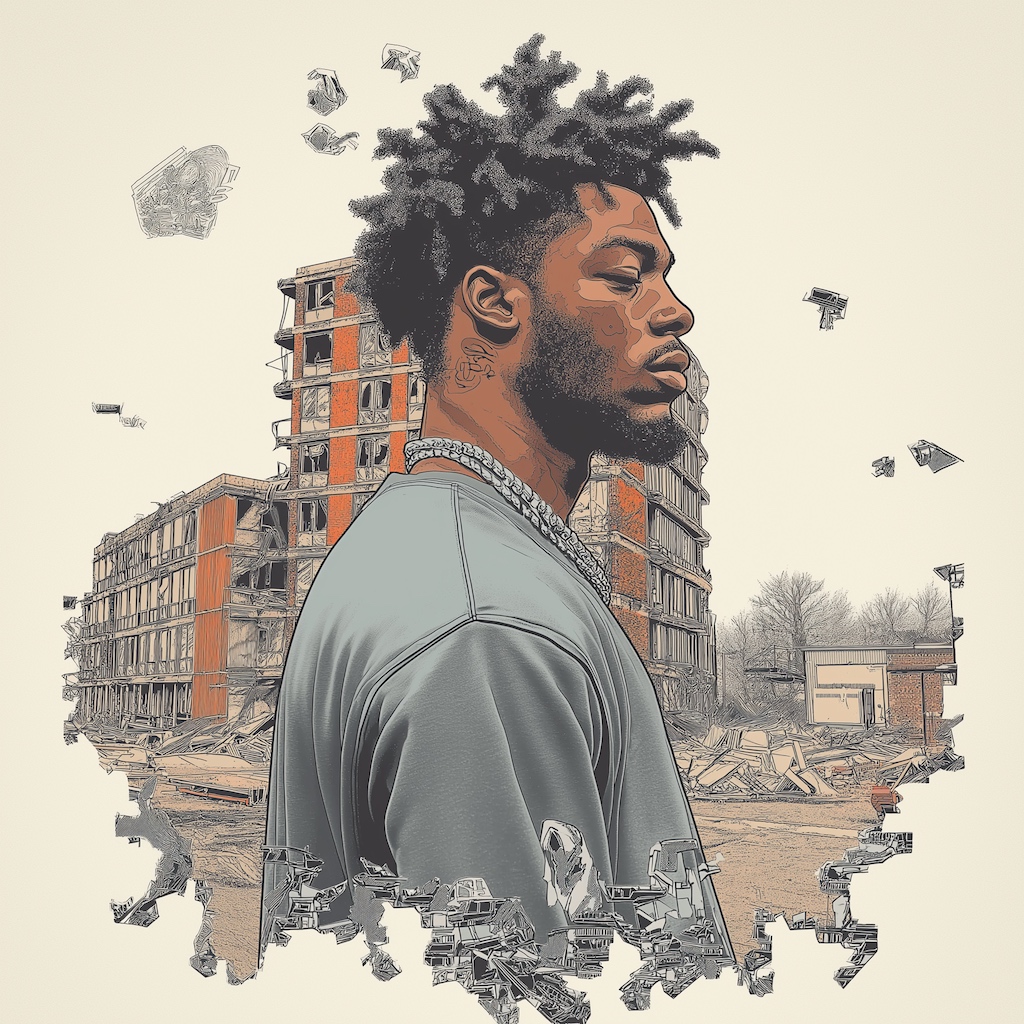 UK Garage, 70s Orchestral Funk, Psychedelic Soul, Piano Jazz riffs, UK Street Poet Rap, Lo-Fi, UK Trip-Hop hybrid at ~80 BPM, Falsetto vocals haze in reverb, contrasted with deep baritone preacher passages and South London spoken rap verses in British cadence, Broken garage shuffle and swung hi-hats ride heavy sub-bass, layered with vinyl crackle, dub echoes, and analog grit, Rhodes chords and Hammond B3 swells add warmth, while soul-jazz piano vamping drives the groove, Wah guitar licks weave around a fat pocket bassline and heavy laid-back drums, Cinematic string swells and sharp horn stabs add drama, Extended instrumental breakdowns stretch hypnotic and immersive, carrying scars, fire, and authenticity through a UK lens