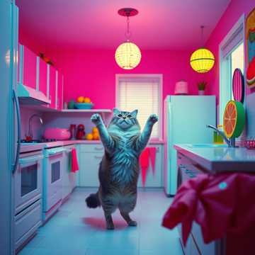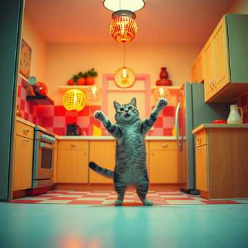 High-energy Daft Funk-style track with heavy funk bass guitar, funk rock guitar riffs, jazz fusion brass, syncopated hand percussion, and layered male/female call-and-response vocals, Includes disco strings, slap bass solos, kitchen-sound FX, vocoder lines, cat meow samples, and gospel choir sections, Think Bootsy Collins meets Parliament-Funkadelic, Daft Punk, and a funky cartoon kitchen rave, Uplifting, weird, hilarious, groovy, and irresistibly danceable