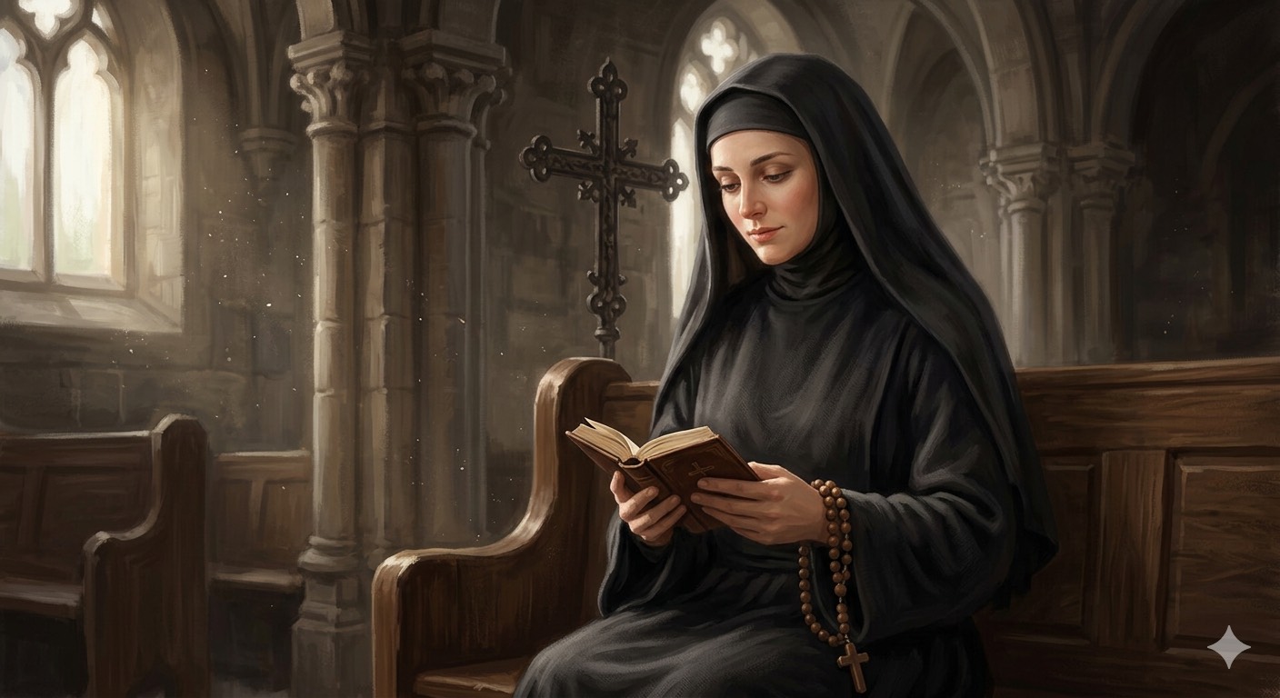 Gregorian chants singing, male and female monks singing, symphonic power metal, melodic, orchestra, epic, fantasy
