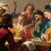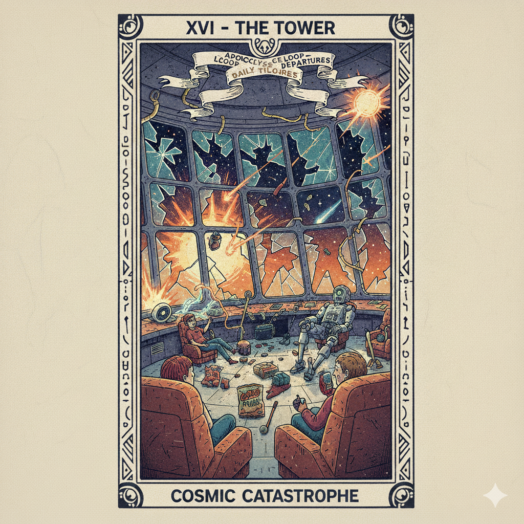 Baroque Pop and Glam Rock energy blend as lush orchestral strings and a percussive harpsichord set a regal intro, punctuated by gritty, distorted electric guitar riffs, Theatrical male/female harmonies soar over sudden tempo shifts, toggling between stately verses and explosive, swaggering choruses at 110 BPM, Brass fanfares and timpani heighten drama, while ornate flourishes create a majestic, tumultuous soundscape fitting for an apocalyptic celebration