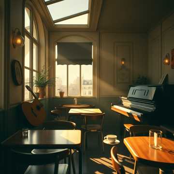 Soft Parisian café ambience built from intimate nylon-string guitar, warm felted piano, and gentle musette-style accordion, Slow sway around 80 BPM, brushes and upright bass barely there, like a heartbeat under the tables, Melody circles in understated motifs that trade between instruments; mid-track lift with fuller chords then a hushed return, Perfect for quiet focus and early-morning warmth, with a cozy, lived-in mix that feels close and analog, accordion
