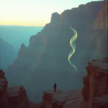 Deep acoustic guitar with wide, expansive arpeggios, subtle airy harmonica weaving through phrases, Medium-slow tempo, voice intimate yet soaring, long breaths between lines, Atmosphere vast, open, with tension and release, evoking vertigo and infinity, Melodic lines rise and fall like cliffs and canyons, leaving space for silence, guiding the listener through emotional depth and introspection