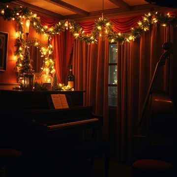 The track blends liminal holiday jazz and psybient, opening with spectral female choir drifting over delicate jazz piano and a warm, walking double bass, A deep male crooner vocal drifts over the top of the shimmering chill landscape, Soft brushes and wintery glitch percussion add both swing and surreal texture, enveloped in nostalgic, misty ambient layers for an uncanny, dreamlike glow, ‑muffled, ‑hiss, ‑lo-fi, ‑harsh high end, ‑distorted, ‑generic pop, ‑trap beats, ‑loud drums, ‑heavy rock guitar, ‑synthetic brass, ‑abrupt cut