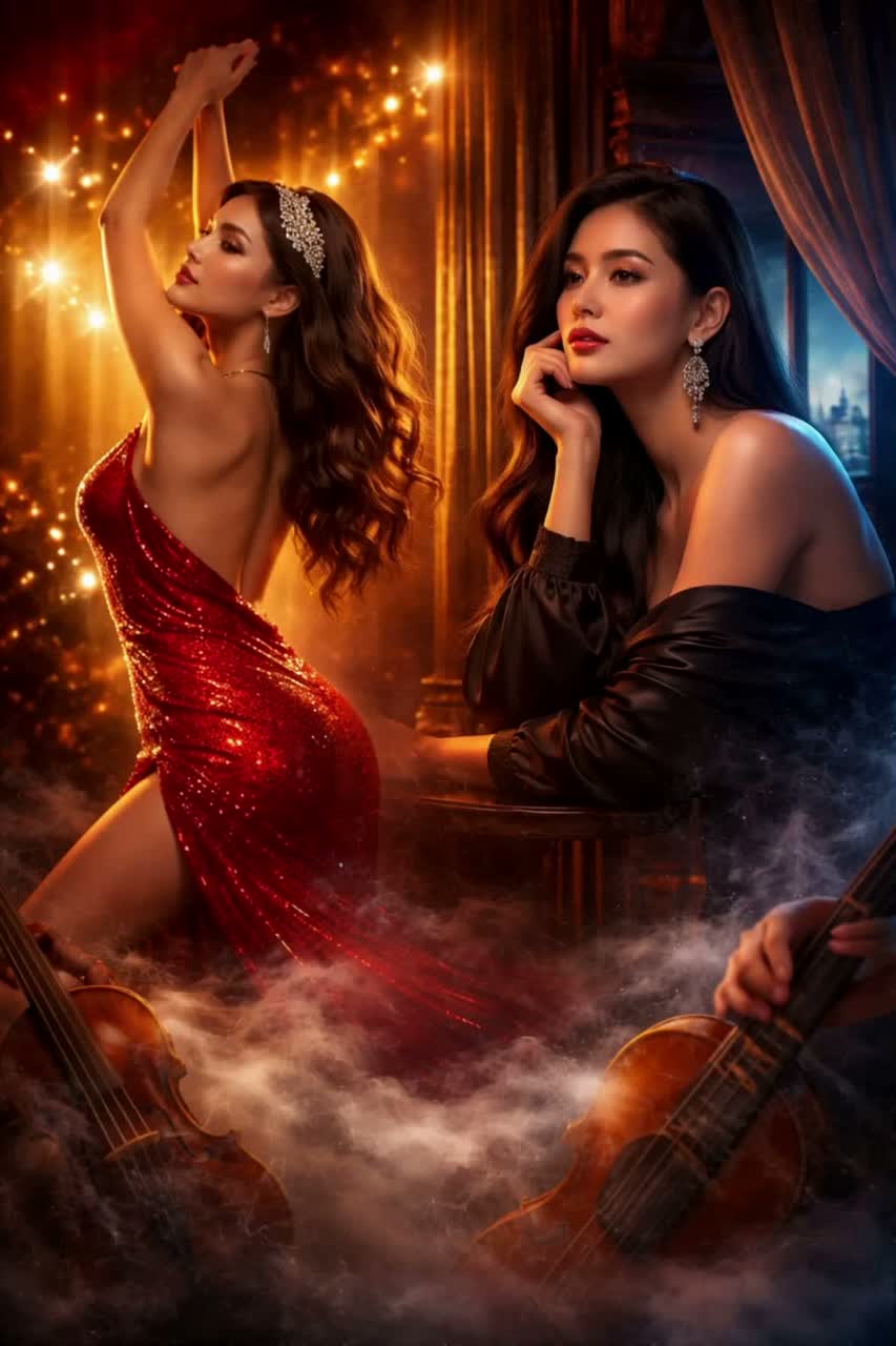Theme: Two queens of rhythm—one in spotlight, one by the window, A bilingual sonic seduction that starts as shadow and ends as flame, Intense, elegant, cinematic, dancefloor-dominating, Instruments: Latin guitar, Balkan strings, electronic violin, deep house kick, reversed synth FX, Arabic percussion, ambient bass swells, Vocal Style: Sexy & confident female lead, bilingual phrasing, echo call & response, whispered bridge, rhythmic breathing, spoken seduction, Mood: Fierce, cinematic, mysterious, hypnotic, club ritual energy, live-stage euphoria, FX: Vocal loops, panning, club echoes, deep reverb stabs, reversed risers, whispered drops, ‑Pop rock, ‑ballad, ‑country, ‑lo fi, ‑folk, ‑acoustic, ‑indie, ‑slow tempo, ‑excessive orchestral, ‑overly busy vocals