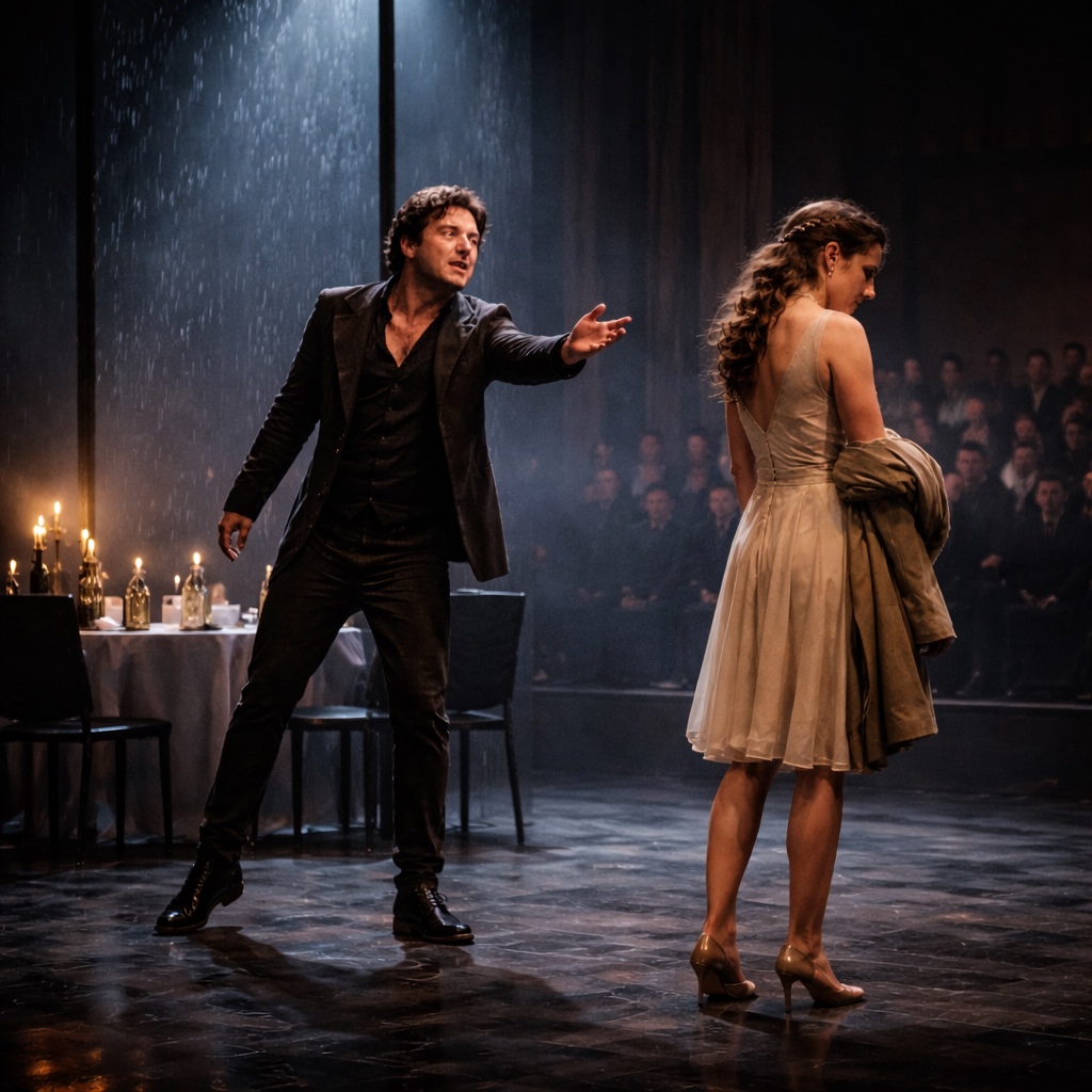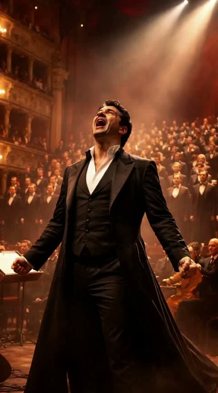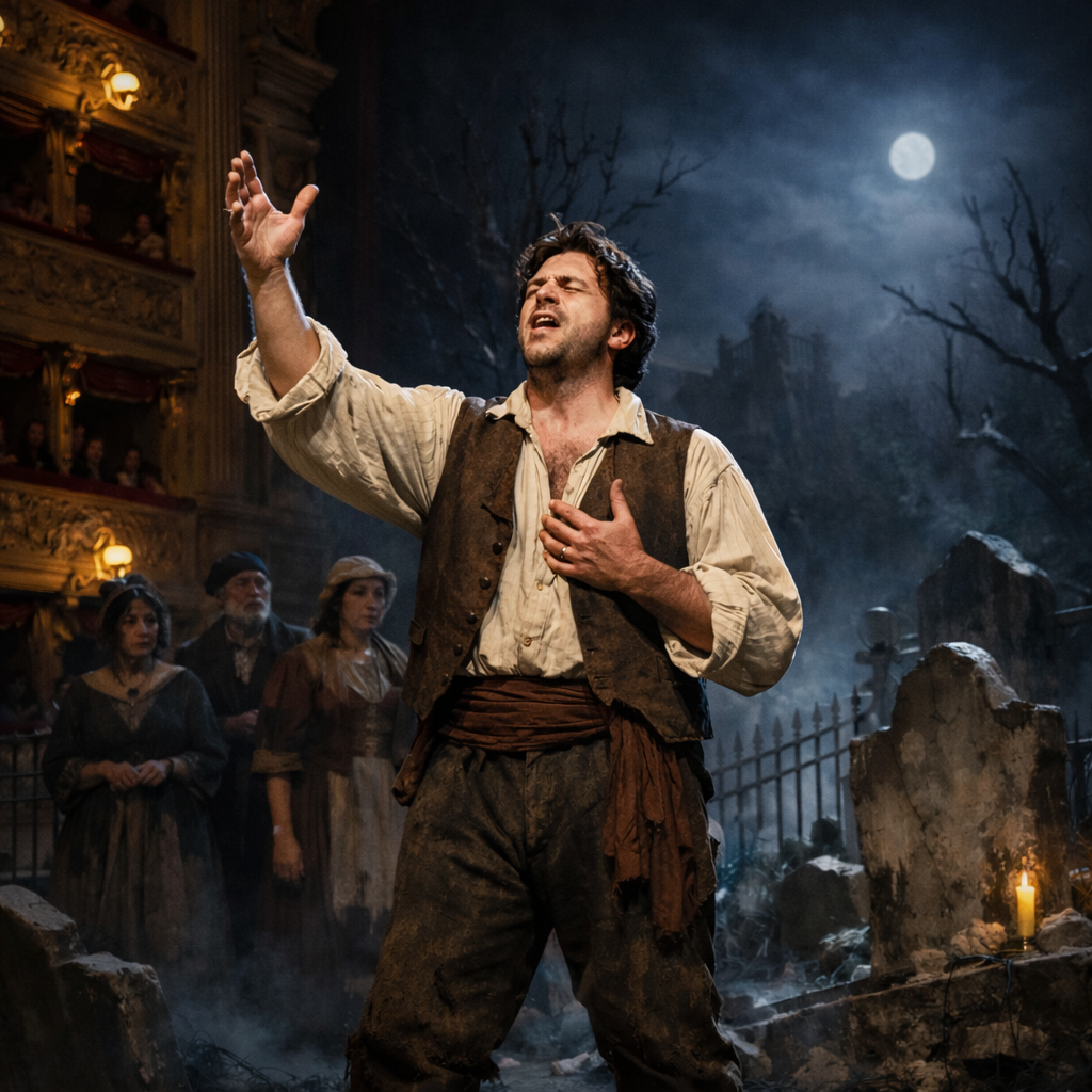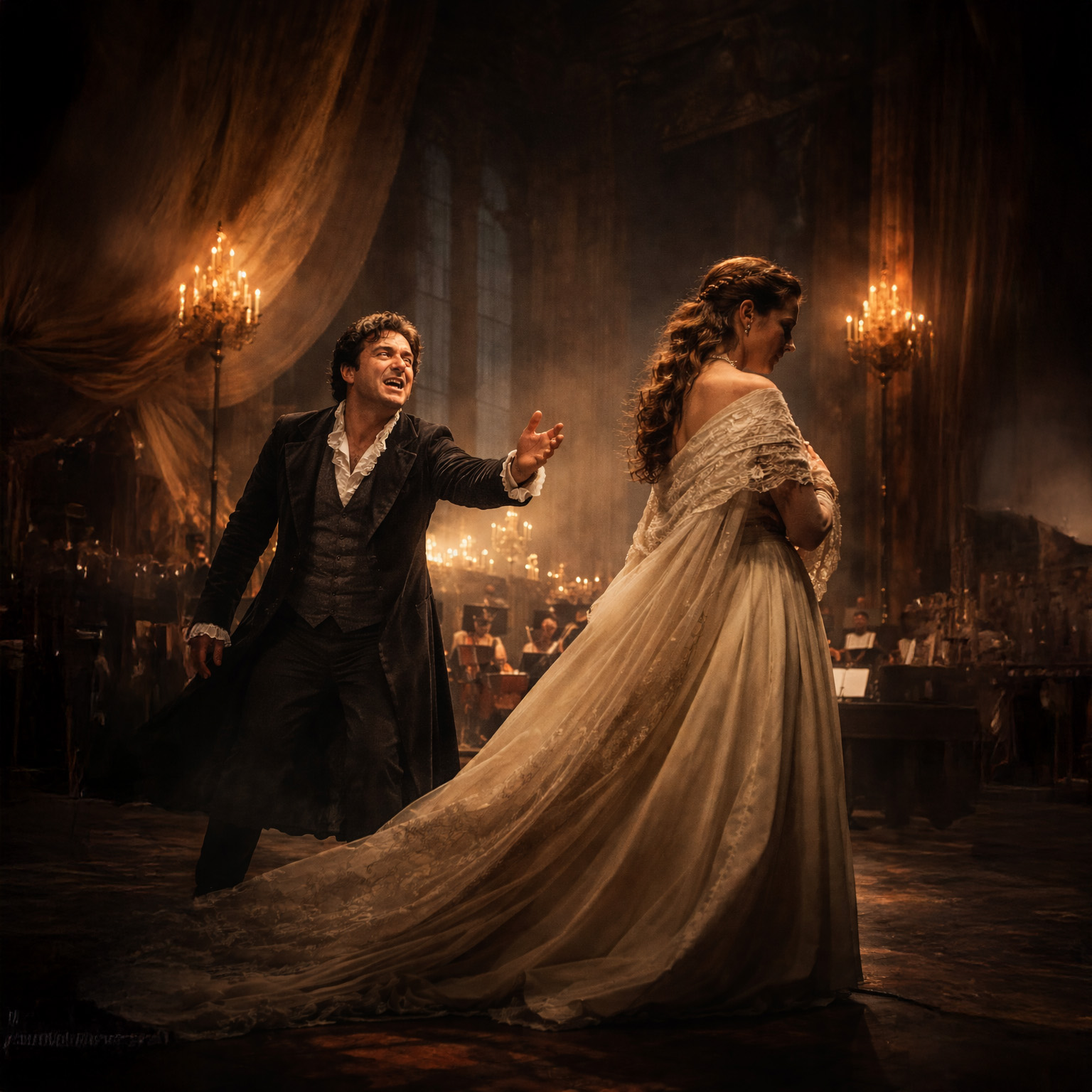 Grand Romantic Italian opera in Puccini style, Full symphony orchestra: lush legato strings, expressive woodwinds, French horns, harp, timpani swells, restrained brass, Slow rubato, elastic tempo, dramatic dynamic range, Operatic Tenor lead (lyrical, emotional), Soprano as distant memory/echo only (never leading), Mixed SATB choir (solemn, homophonic), Natural hall reverb, no synths, no modern drums, Through-composed structure, Rising dominant tension before climax, Final harmony: sustained unresolved minor add9 chord, emotionally hanging, ‑synth, ‑electric guitar, ‑EDM, ‑trap, ‑bass guitar, ‑piano