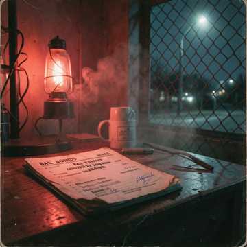 Gritty outlaw country with a modern edge, inspired by the raw storytelling of **__**, **__**, and a darker twist of **___**, Slow-to-mid tempo (85–105 BPM), swampy groove with a heavy, steady kick drum and brushed snare, Prominent **twangy electric guitar** with subtle overdrive, backed by **acoustic strumming**, **slide guitar fills**, and a deep, warm **bassline**, Occasional **harmonica accents** for grit and authenticity, Low, rugged male voice with a gravelly tone—confident, slightly dangerous, but calm under pressure, Delivery should feel like a seasoned bail bondsman telling the truth, not trying to impress, Slight Southern drawl, conversational phrasing, with emotional weight on lines about trust, risk, and judgment, Dusty, late-night energy, Neon lights flickering outside a county jail, Tension mixed with control, The feeling of making hard calls while the rest of the world sleeps, Cool, calculated, and morally gray—but professional