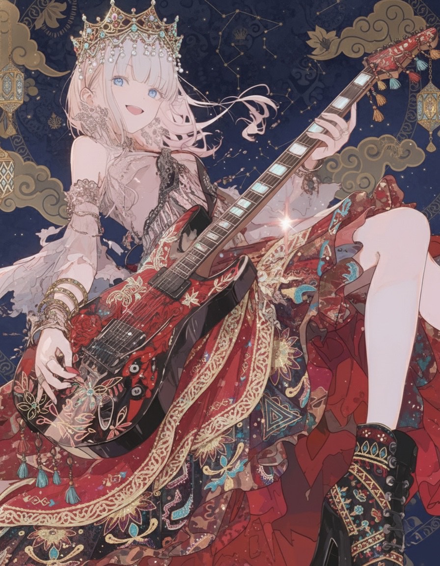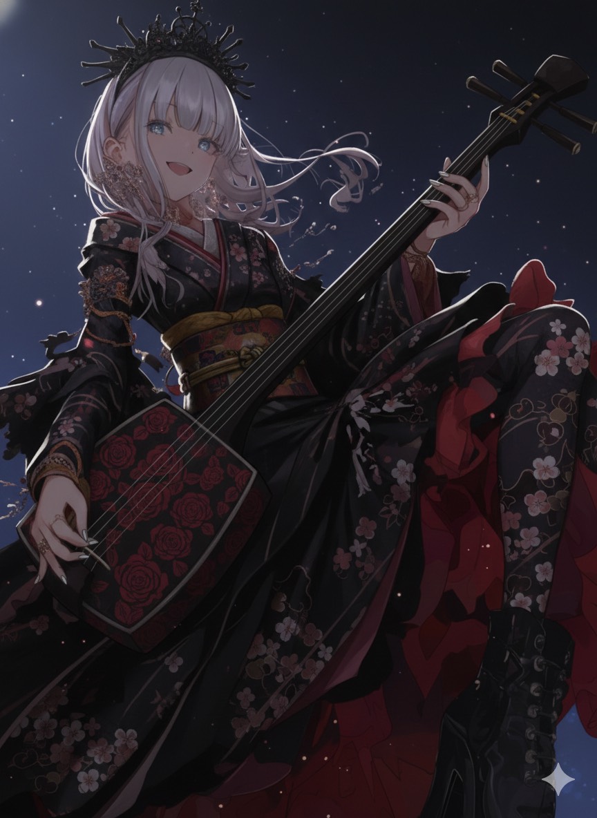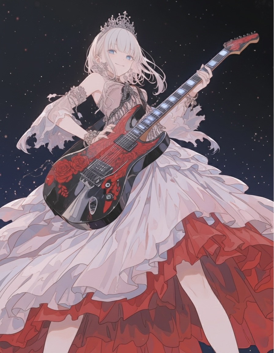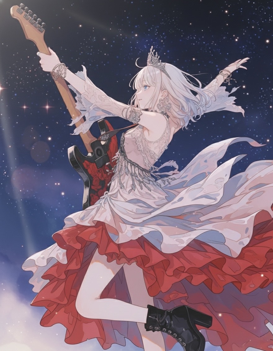 metal, melodic light metal, subtle Japanese elements, elegant and emotional atmosphere, high-skill female vocals with excellent pitch control and clear, soaring high-register singing, mostly clean and expressive vocals, one light high scream at the climax, dramatic yet refined tone, bright but slightly melancholic, light, tone, theme, clean, female vocals, bright, refined, emotional, dramatic, soaring