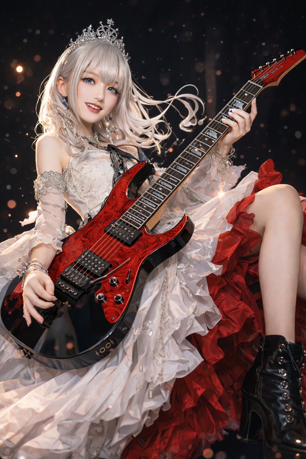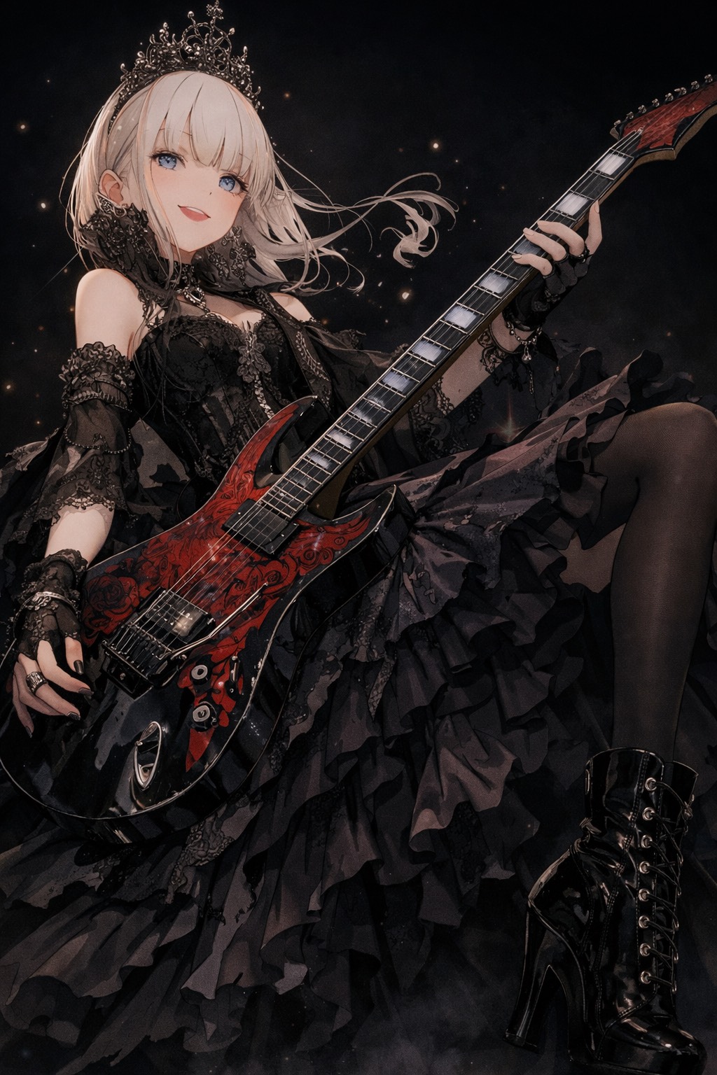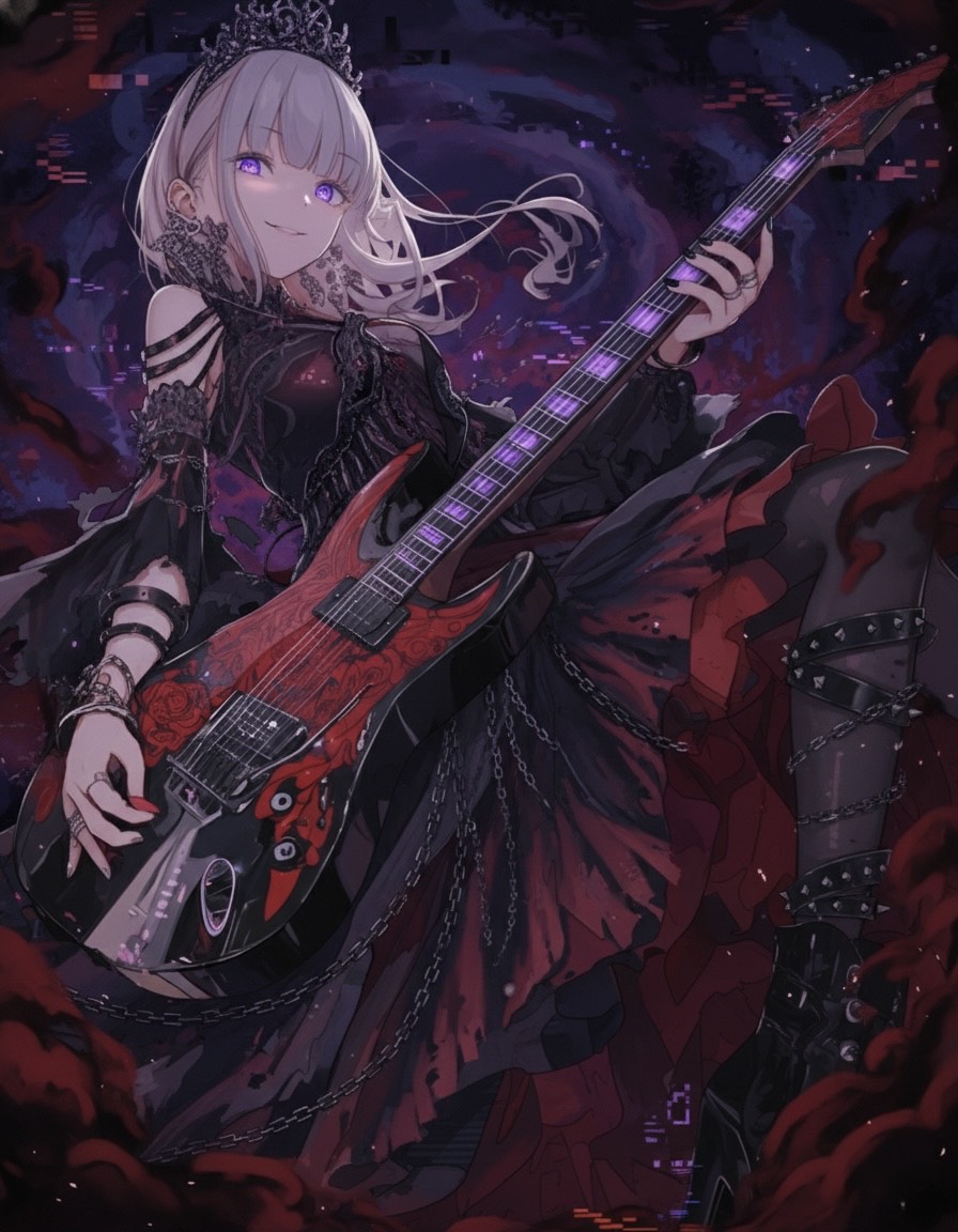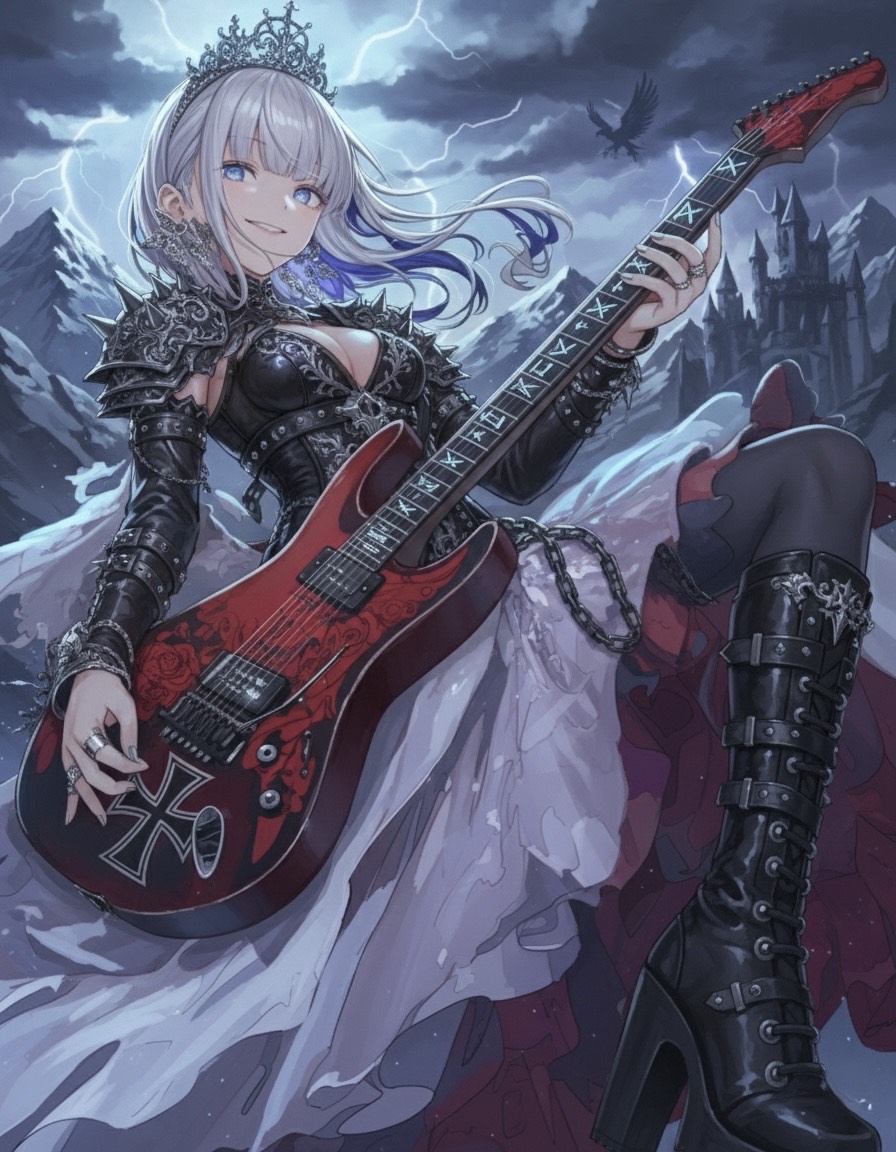 metal, Dark melodic metal with low-tuned heavy guitars, aggressive palm-muted riffs, fast double-kick drums, deep thunderous bass, and cinematic minor-scale atmosphere, Dramatic build with explosive chorus and extended technical guitar solo, High-spec female vocalist delivering soaring high-register melodies and piercing high shouts, Emotional intensity, dark fantasy tone, Theme: the reborn Skybreak Princess rising from the abyss to shatter destiny, emotional, female vocals, theme, soaring, dramatic, tone, low, piercing, deep