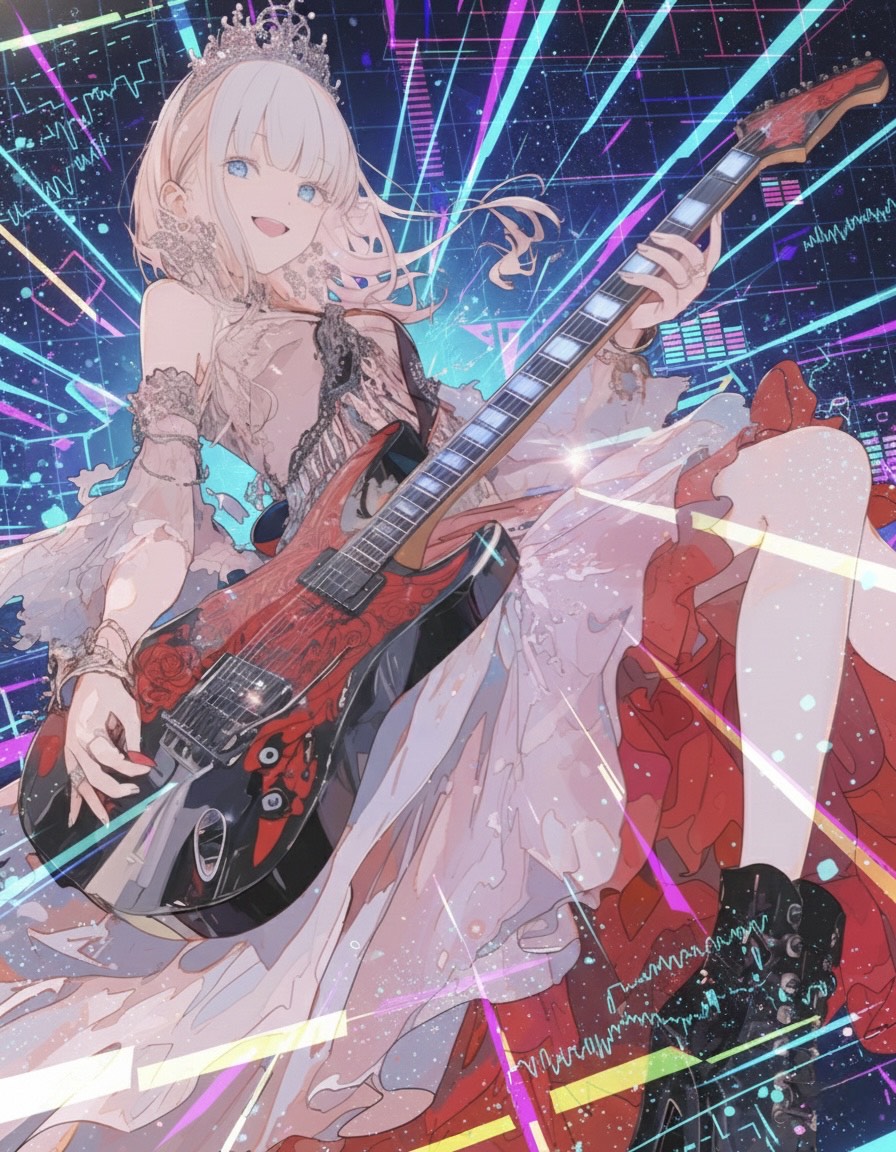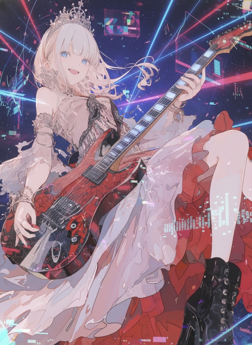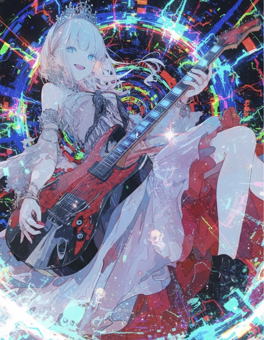 Digital rock track with distorted guitars and synth layers, High-spec female vocal with clear, powerful tone and modern expression, cutting sharply through the mix