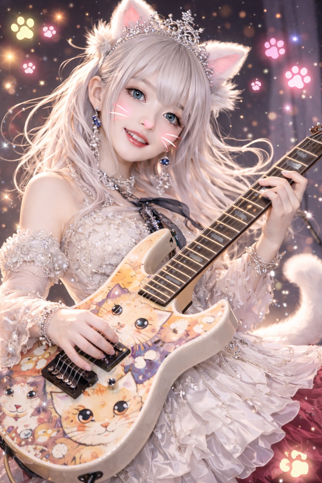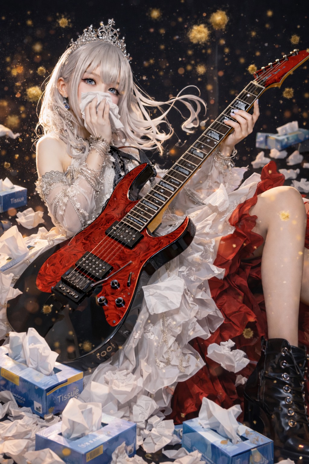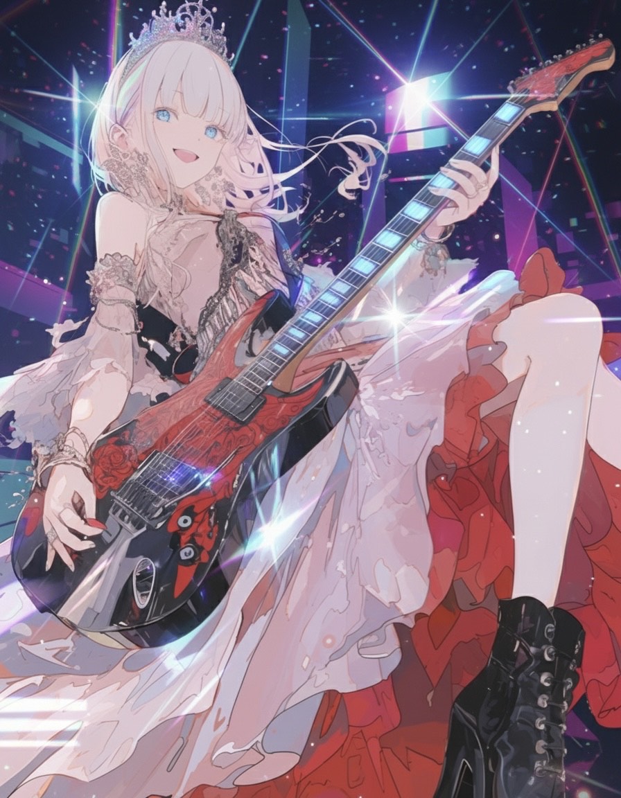Digital rock track with distorted guitars and synth layers, High-spec female vocal with clear, powerful tone and modern expression, cutting sharply through the mix