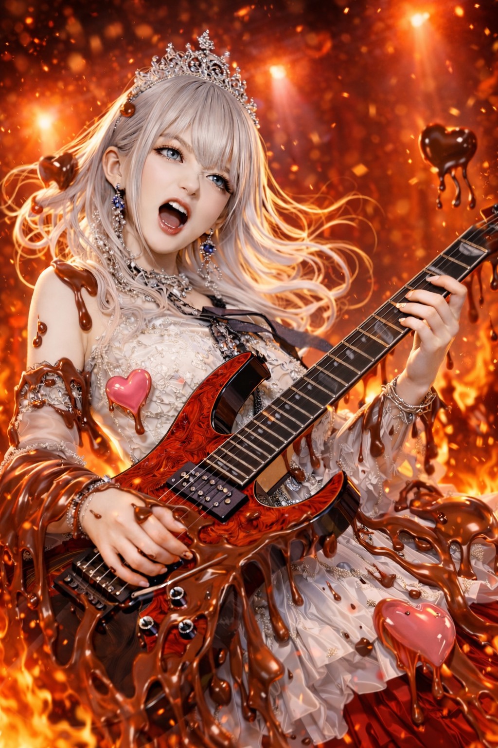 metal, high-energy hard metal song themed around Valentine’s Day, aggressive yet melodic with powerful distorted guitars and driving double-kick drums, highly skilled female vocals with excellent pitch control and intense high-register singing, frequent soaring high notes and multiple controlled high screams at climactic moments, dramatic and explosive atmosphere, combining sweetness and passion, energetic guitar solo with fast alternate picking and expressive bends, dramatic, female vocals, soaring