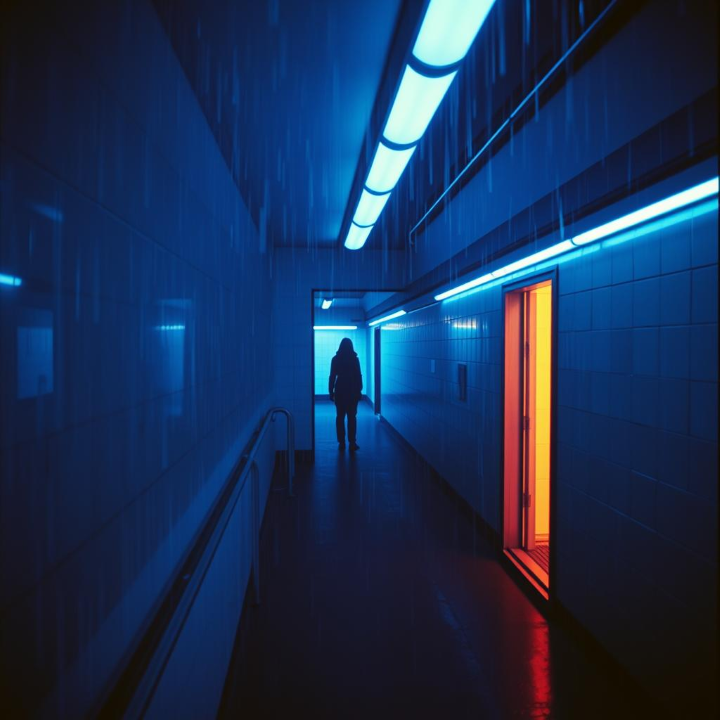 Mood: Late night, neon lights, blurred city, lingering emotion, distance