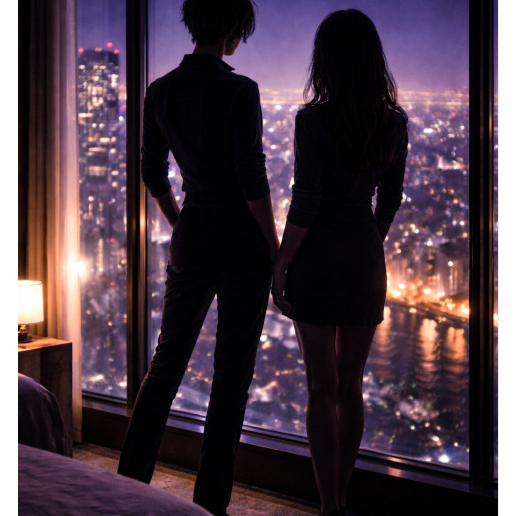 Mood: Late-night city, elegance, quiet passion, adult romance, cinematic calm