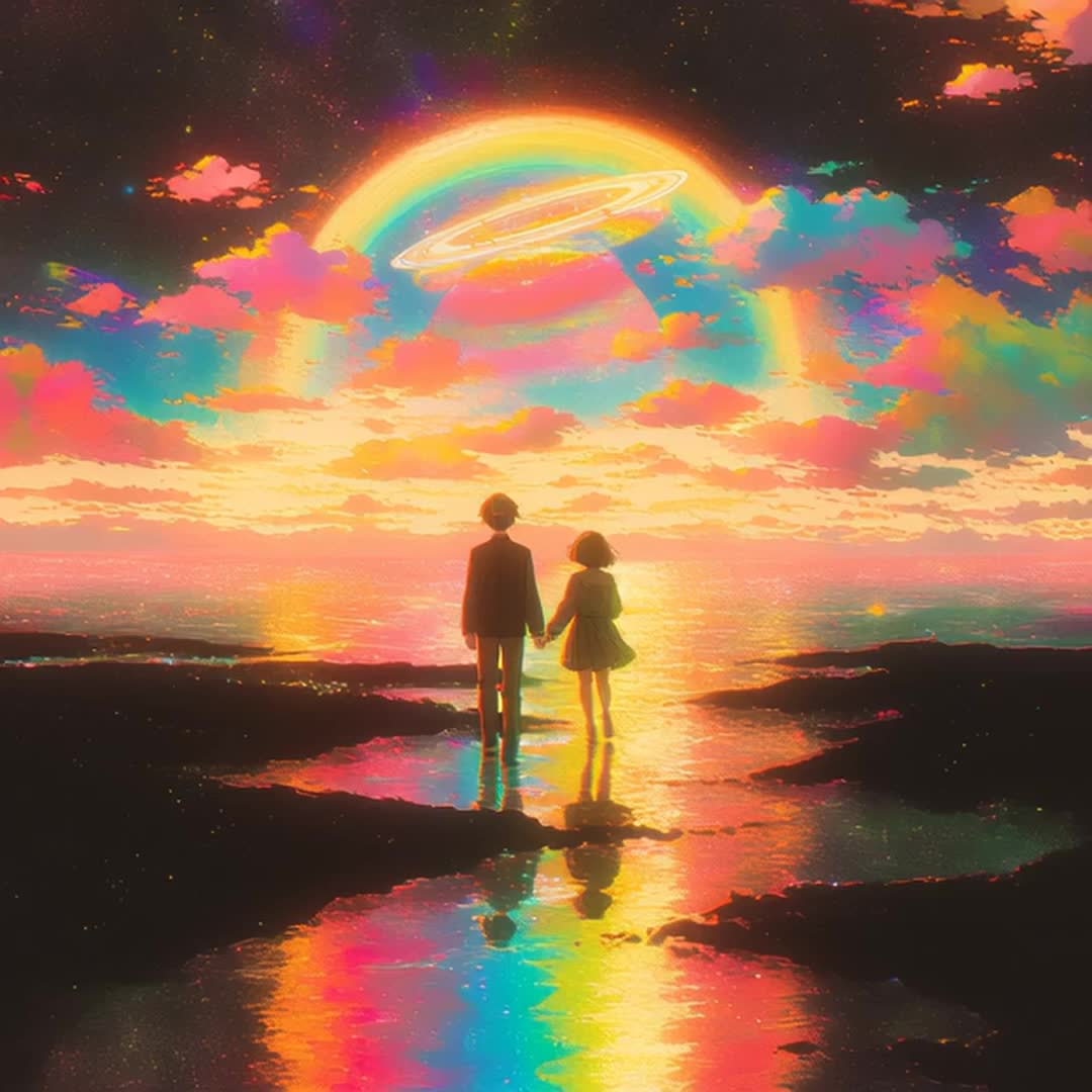 Lush ambient synth pads open, evolving into a brisk groove with crisp pop drums and syncopated neo-funk bass, Bright guitar riffs and sparkling electronic accents uplift sweet female R&B vocals, Choruses expand with rich harmonies and energetic beats, The outro melts into dreamy, kawaii textures, smooth synth leads, playful percussion, and glistening layered electronics