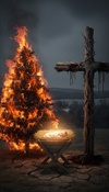 A solemn ancient funeral dirge featuring haunting male vocalizations supported by stirring violin melodies, Deep, resonant percussion underpins each section, evoking gravity and grief, while surging dynamic swells convey resilience and power amidst the pervasive sadness