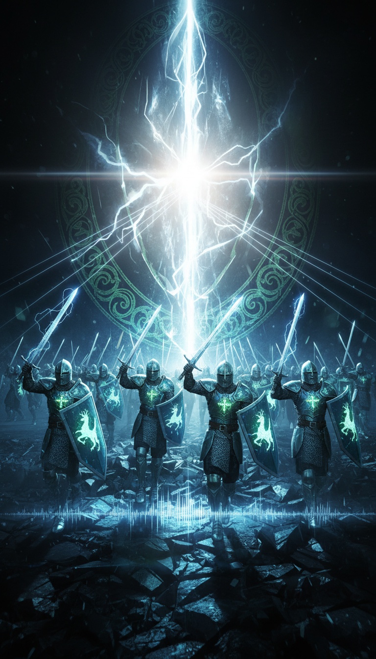 A high-energy cinematic electronicore track merging futuristic metalcore with traditional Irish dance music, Hyper-polished synth leads, glitchy arpeggios, and shimmering pads collide with razor-tight djent-style guitars and punchy modern metal drums, Rapid, percussive rhythmic patterns inspired by Irish step dancing drive the groove—syncopated, relentless, and propulsive, Traditional Celtic instrumentation (fiddle, low whistle, uilleann pipes, bodhrán) weaves through the mix, sometimes leading melodically, sometimes reinforcing rhythm, The song surges between explosive drops and soaring, melodic movements—neon electronic textures swelling and collapsing into folk-driven passages before snapping back into crushing modern intensity, Epic, dance-like momentum throughout, celebratory yet aggressive, ancient and futuristic at once, Clean, pristine production with dramatic dynamics, suitable for long-form evolution rather than looped structure
