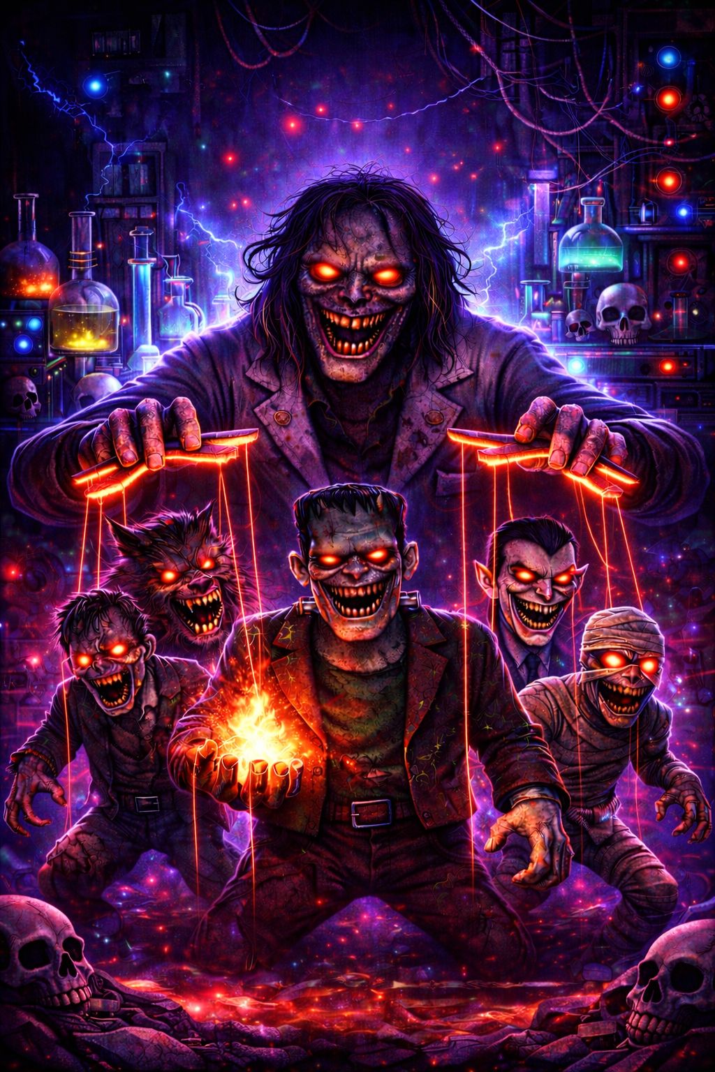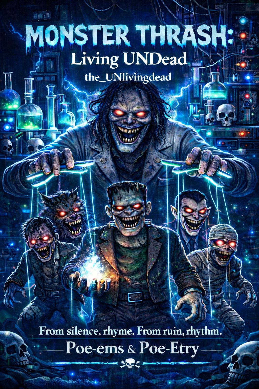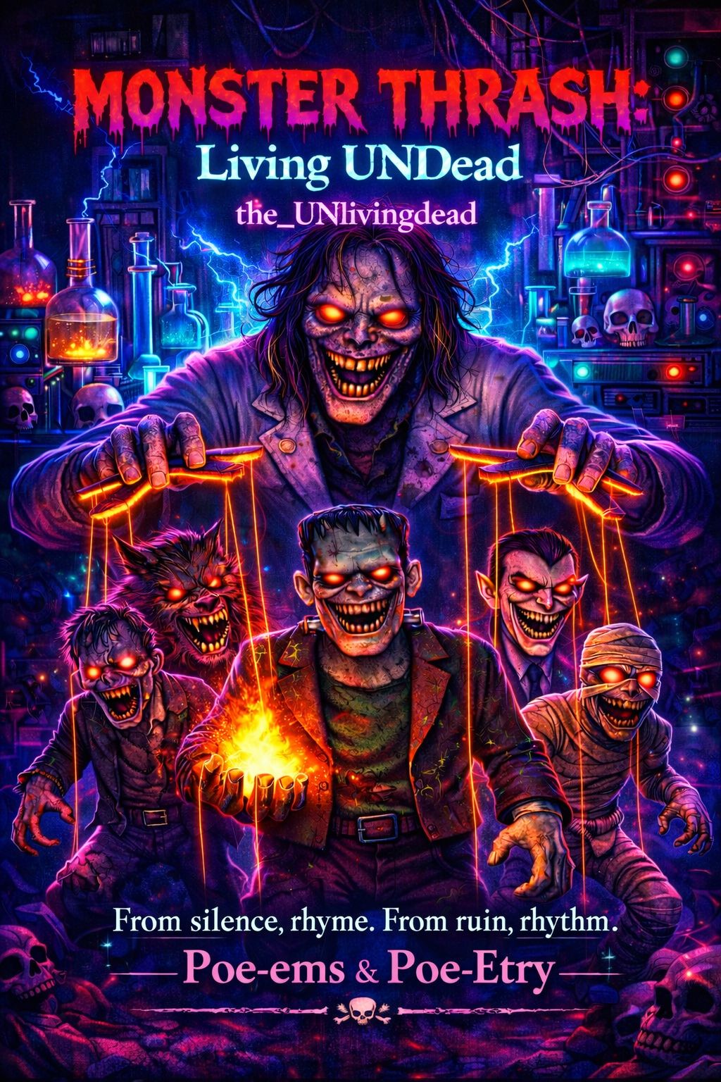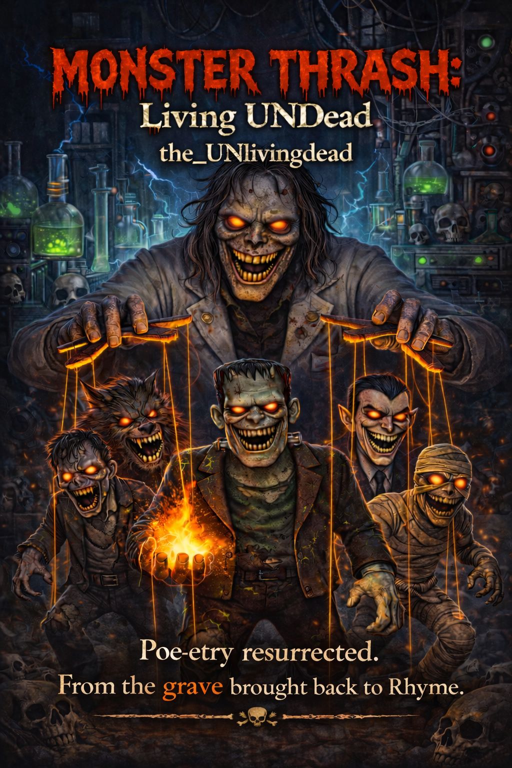Genre: Aggressive Alternative Nu Metal / Metalcore, Style: Dark, SPOOKY HORROR-THEMED, and High-Energy Mosh Anthem (Sequel), Theme: A frantic, violent party of classic horror creatures (Zombies, Vampires, Wolfman), Instrumentation: Heavy, downtuned, chunky rhythm guitars (KVDE rap groove) with dissonant synth accents and **graveyard sound effects** for the horror feel, Use fast, technical drumming and booming sub-bass, The production must be loud, raw, and chaotic, mirroring the intensity of MONSTER THRASH Pt, 1, Vocal Style: Male vocals, Intro/Breakdowns feature a raw, guttural, demonic voice, Verses use aggressive shouting/singing (Dayseeker style) and high-speed, manic rap (KVDE style), Chorus is a massive, raw, and desperate screamed anthem, Mood: Urgent, violent, chaotic, and suited for a mosh pit with classic horror flair, Keep this prompt saved