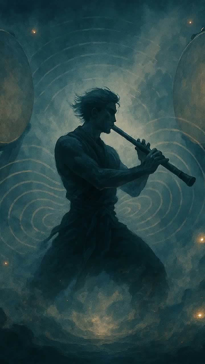 Minimal music video with support-style battle flute, Tempo 102 BPM, 4/4, Male voice, Percussion and shakuhachi flute with ritual, rhythmic, danceable patterns, Deep bass and odaiko drums for strong impact, Intro/outro voice only, breathing, footsteps, Structure: Intro 0:00 voice only, Verse A 0:25 percussion build, shakuhachi enters, Chorus 1 1:05 rhythmic, light echo, Instrumental/Dance 1:35 percussion-heavy, deep bass, odaiko prominent, shakuhachi dancing, circular rhythm, Verse B 2:15 minimal voice, layered textures, Chorus variation 2:45 repeat with pitch/texture changes, Near silence 3:15 distant shakuhachi, minimal sounds, Final Chorus 3:45 full voices + instruments, Outro 4:05 voice only, fading, Mood mystical, ritual, supportive, uplifting, Vocal chant-like, layered, minimal, Percussion varied, organic, Flute rhythmic, melodic, blends with percussion