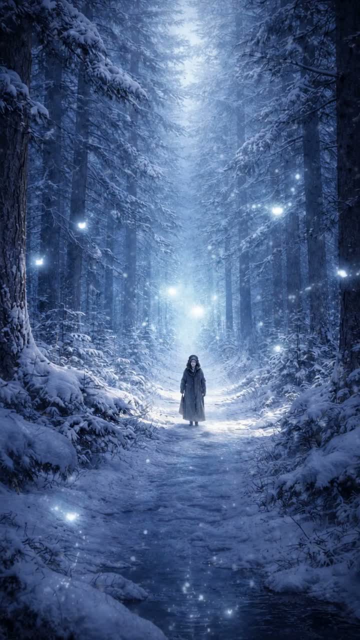 Instrumental, cinematic ambient Japanese traditional fusion, Quiet winter landscape in a cold region, Walking slowly through deep snow, crisp air and silence, Main melody played by shakuhachi, breathy, emotional, restrained, Koto plays sparse icy plucked notes like frozen drops, Marimba adds soft wooden pulses, minimal and slow, echoing footsteps on snow, Deep low drone and subtle synth pads create cold air and vast space, Tempo is slow, calm, dignified, No drums, no vocals, Mystical atmosphere, ancient forest spirits whispering from the distance, faint echoes, reverb-heavy space, Emotion: serene, lonely, pure, spiritual