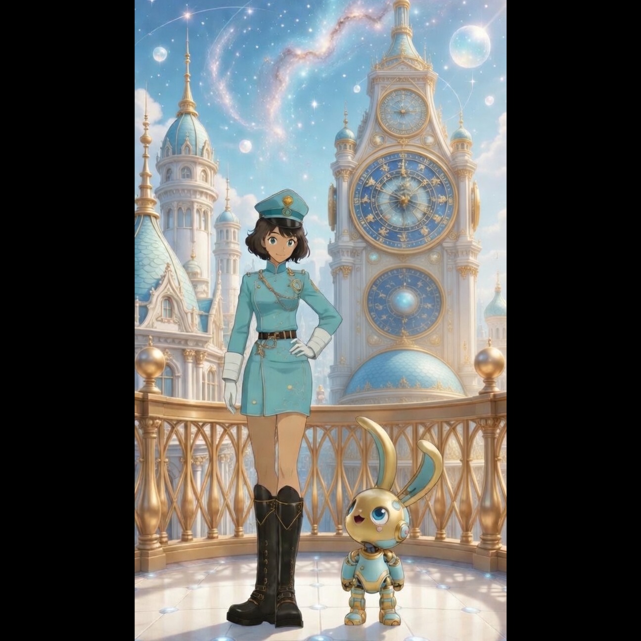 aetherpunk, shimmering synths; victorian wonder meets interstellar adventure, epic, ticking clockwork rhythms, uplifting, orchestral, cosmic choirs, celestial; brass, electronic, orchestral-electronic