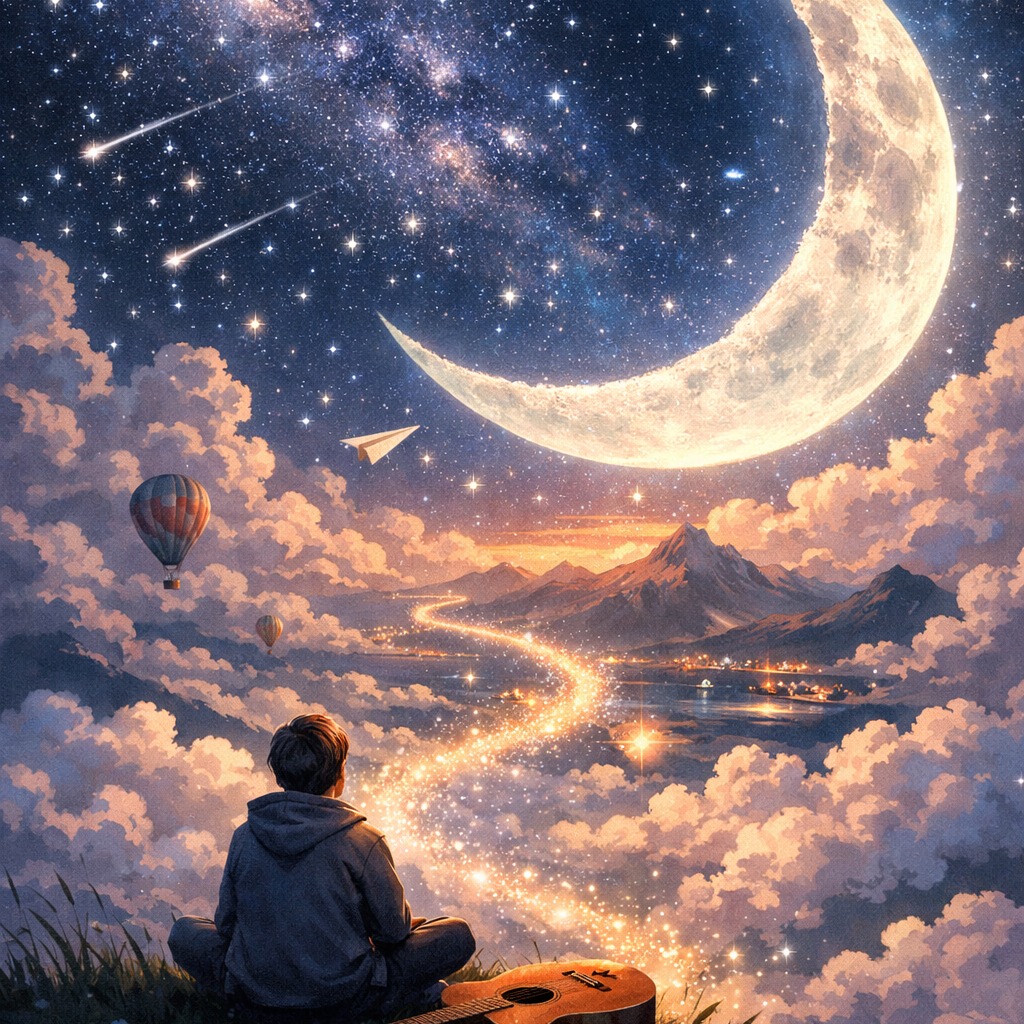 [Focus] [orchestral fantasy ballad] [ethereal layered strings, high violins, lush violas, deep cellos, harp arpeggios] [soft piano motifs interwoven with glockenspiel and chimes] [subtle wind instruments: flutes and oboes for airy, melancholic textures] [gentle percussion, soft timpani rolls, light cymbal swells, atmospheric marimba patterns] [minor key with occasional modal shifts to major for emotional lift] [slow to medium tempo ~80-95 BPM, flowing and lyrical, dynamic crescendos in chorus] [male vocal, tender, expressive, slightly breathy, conveying longing and hope, precise phrasing] [chorus: swelling orchestral layers, layered harmonies, emotional peak, cinematic and dramatic impact] [bridge: stripped instrumentation focusing on solo strings and piano, intimate emotional core] [atmospheric pads and reverbs to create vast open-world feeling, shimmering textures, subtle leitmotif cues] [emotional storytelling throu, Male vocal, low-mid range, warm baritone or light tenor