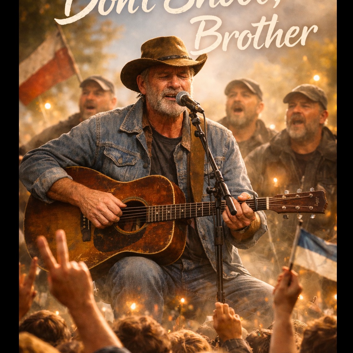 Live acoustic country/folk ballad, 78–84 BPM, key G major (or A major), One instrument only: solo acoustic guitar (fingerpicking verses, gentle strum in choruses), no piano, no drums, no bass, no other instruments, Mature male vocal, raspy and close-mic, emotional, Strong concert ambience: clearly audible crowd noise throughout, cheers and whistles, applause at start and end, Add crowd call-and-response and quiet-to-loud singalong on key chorus lines, especially final chorus, Natural venue reverb, raw live recording feel, minimal processing, dynamic performance, ‑piano, ‑drums, ‑bass, ‑pedal steel, ‑fiddle, ‑synths, ‑strings, ‑choir harmonies (only crowd), ‑heavy autotune, ‑studio-polished pop mix, ‑artificial crowd samples, Male vocalist, gravelly yet melodic, soulful delivery, 1970s singer-songwriter, vocalist, deep, warm soprano, very subtle male choir, distant background harmony, low volume, lead vocal dominant