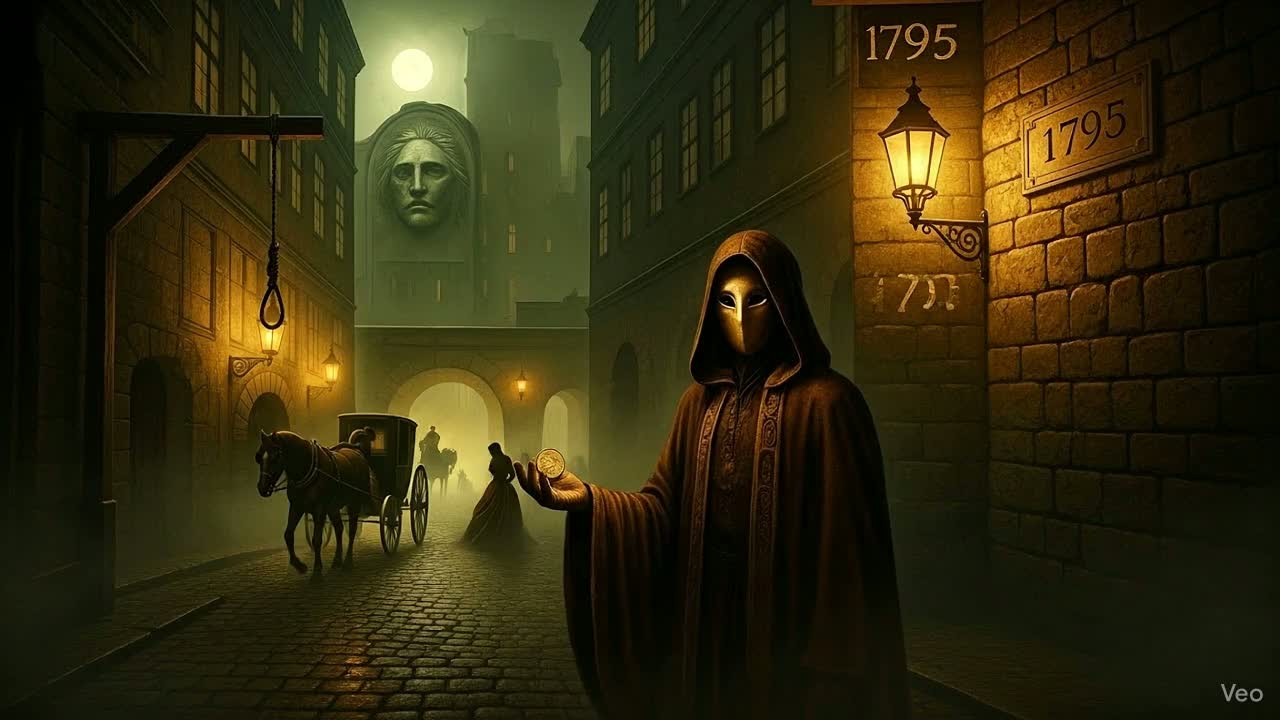 Dark, cinematic instrumental prologue for an epic power metal saga, The atmosphere is cold, tense, and historical — echoing through 18th-century Stockholm, Church bells toll slowly under a stormy sky; distant thunder rolls over cobblestone streets, Faint choirs and low strings rise like ghosts from the mist, The sound swells into symphonic grandeur, blending gothic melancholy with metallic intensity, The music should feel like a warning and a prayer — the city awakening before judgment, Style: symphonic metal, dark cinematic, orchestral ambient