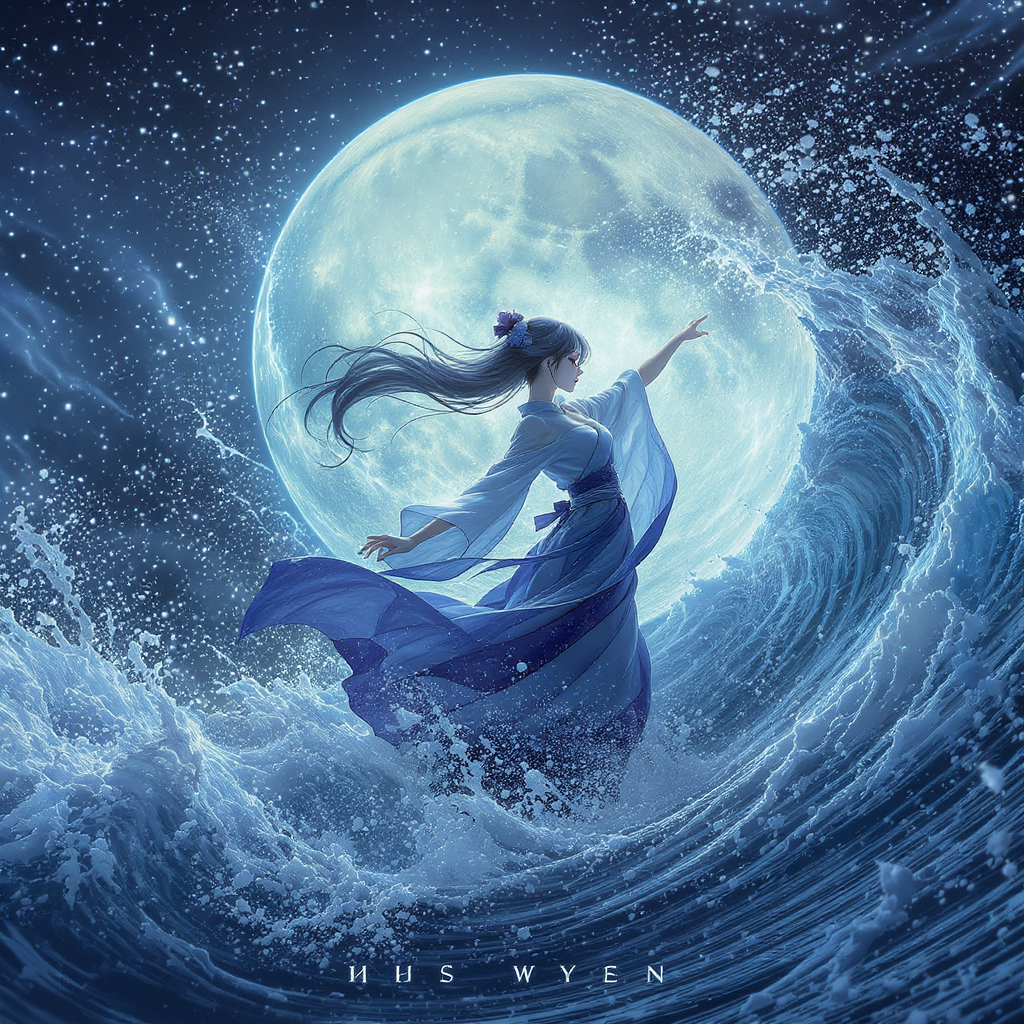 High-energy Japanese EDM fusion with cinematic power, Hard-hitting 808 kick, trap drums, koto and shamisen riffs, shakuhachi and taiko accents, layered with bright synth leads and distorted guitar energy, Female soaring, ethereal vocal (anime-like, hymn-like, long sustained notes) carrying the entire melody, Festival-ready, uplifting, epic, like a water sorceress dancing in the waves under the moon