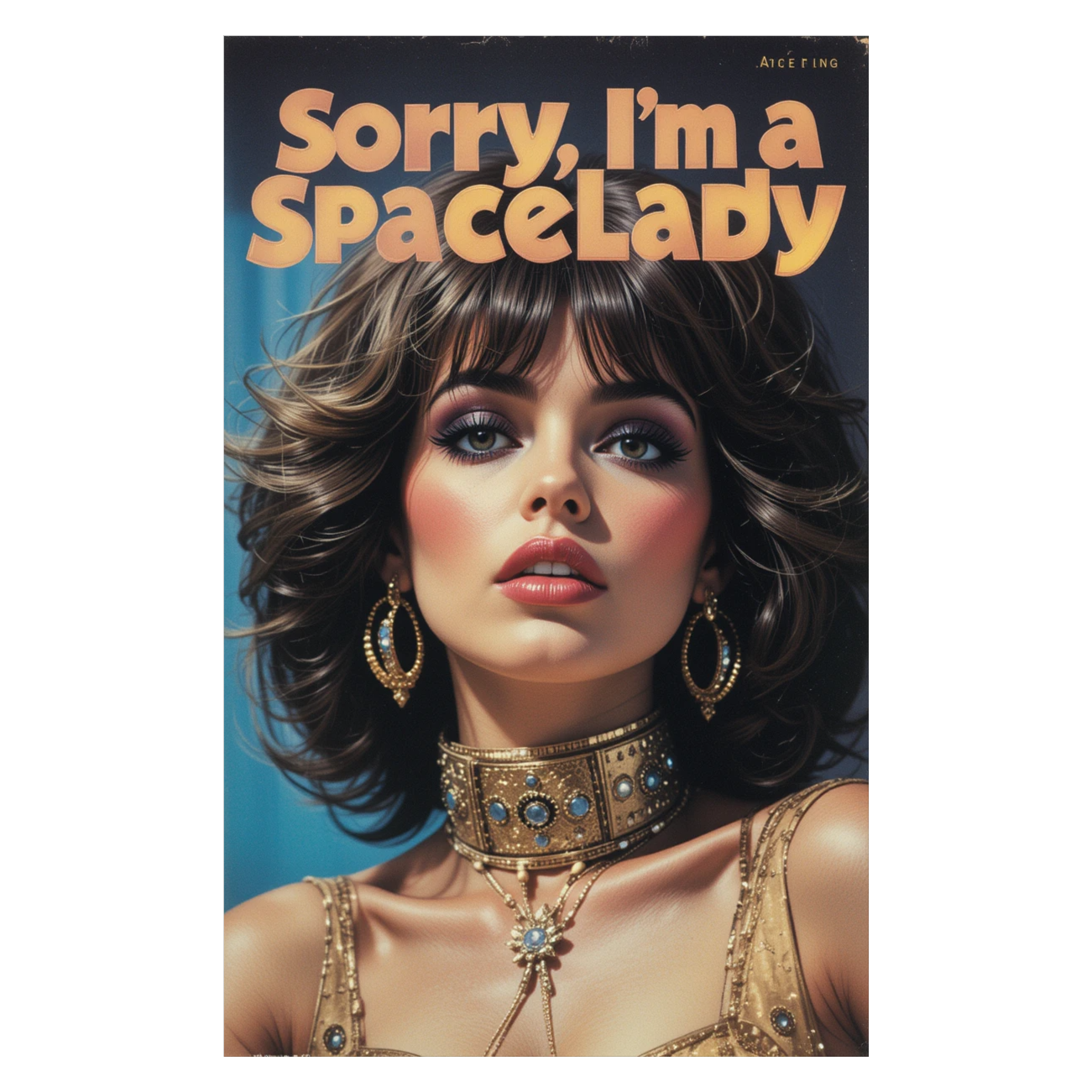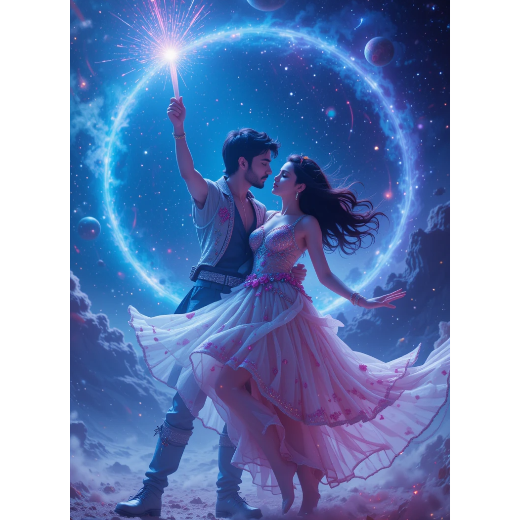 Create a campy 1970s Bollywood space disco theme song, like the opening number of a kitschy sci-fi movie, Blend funky disco basslines, tabla grooves, and shimmering sitar riffs with spacey analog synths, laser sound effects, and sweeping strings, The vocals should be playful and over-the-top, alternating between dramatic spoken-word narration and energetic Bollywood-style singing, with call-and-response backing vocals, Use handclaps, echoing disco tom fills, and cosmic whooshes to heighten the silliness, The mood is larger-than-life, mixing romance, comedy, and cosmic adventure, like a dance party on a spaceship saving the world with love